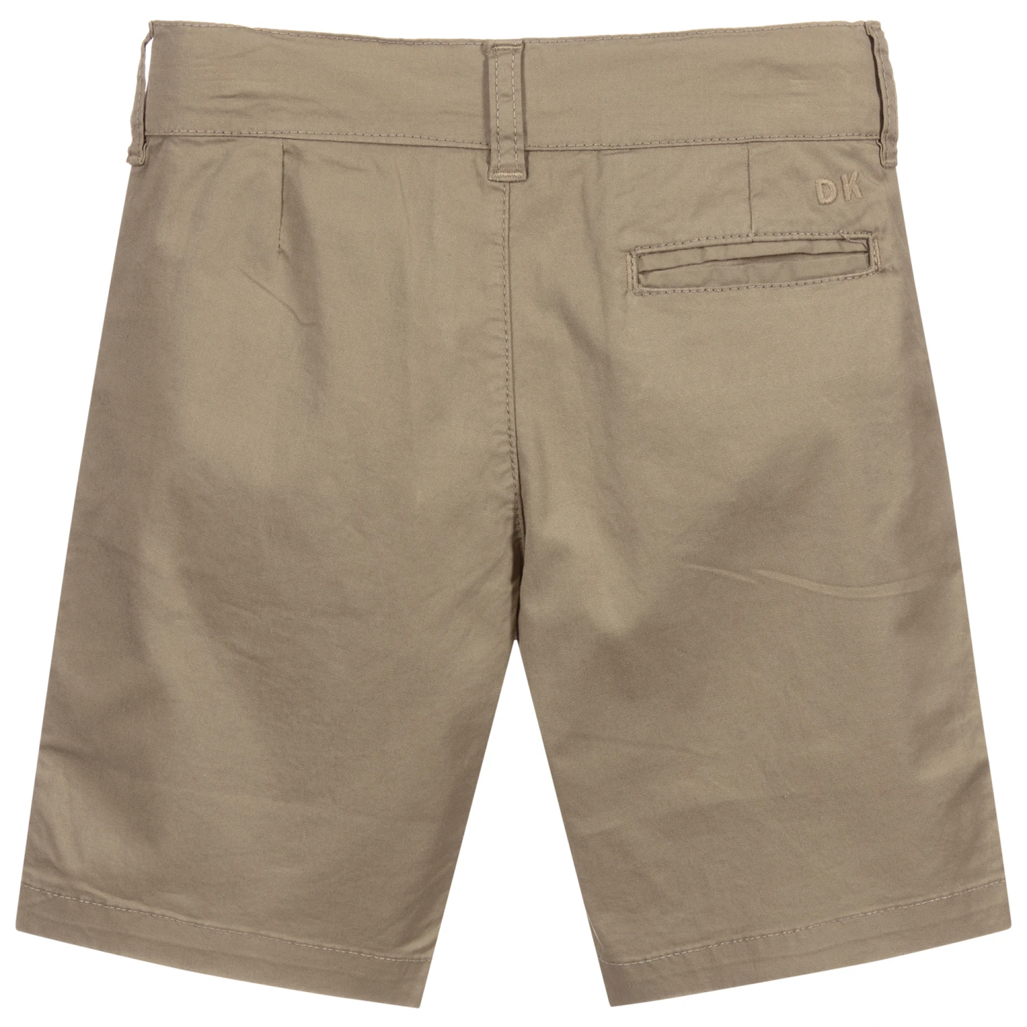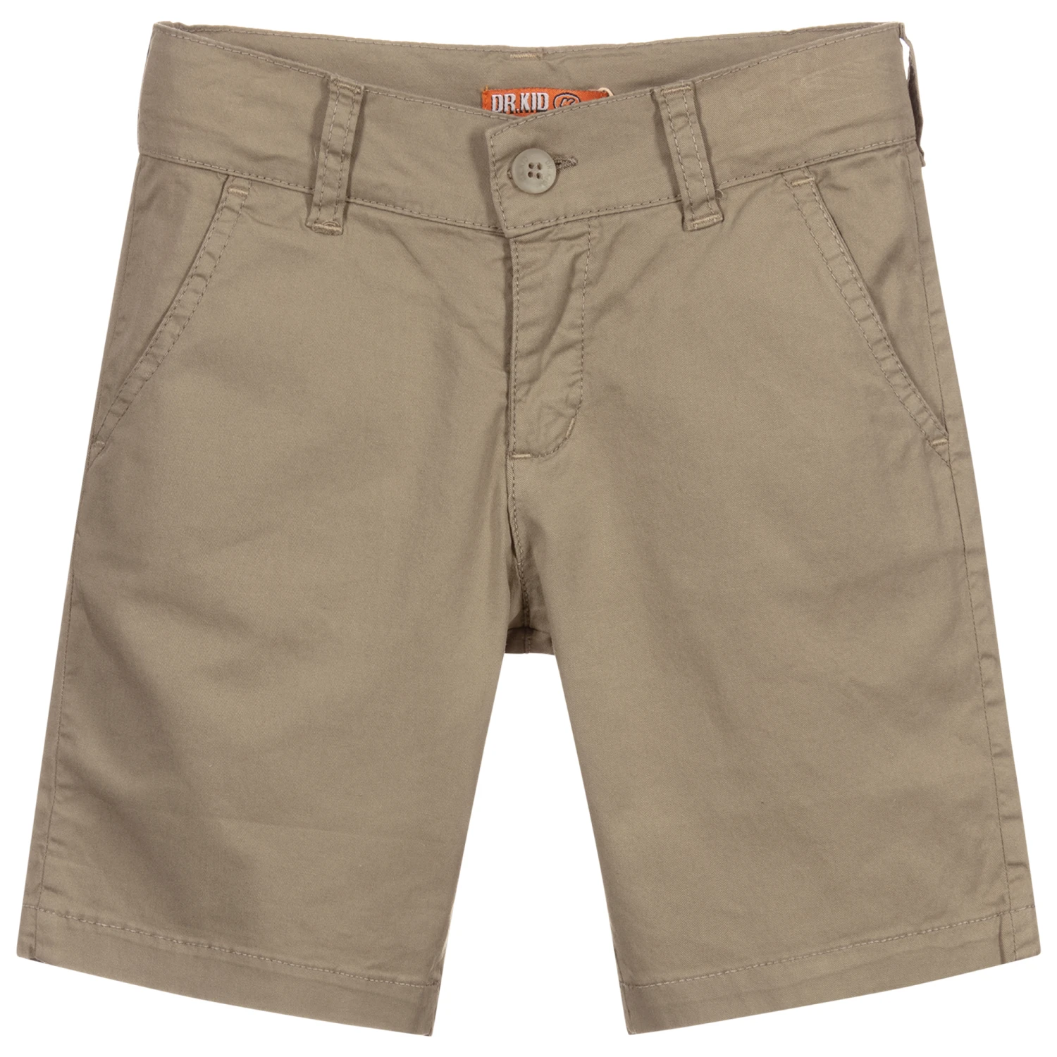 Khaki green shorts for boys by Dr. Kid, made in lightweight cotton twill. They have an adjustable waistband and useful pockets on the front and back.
