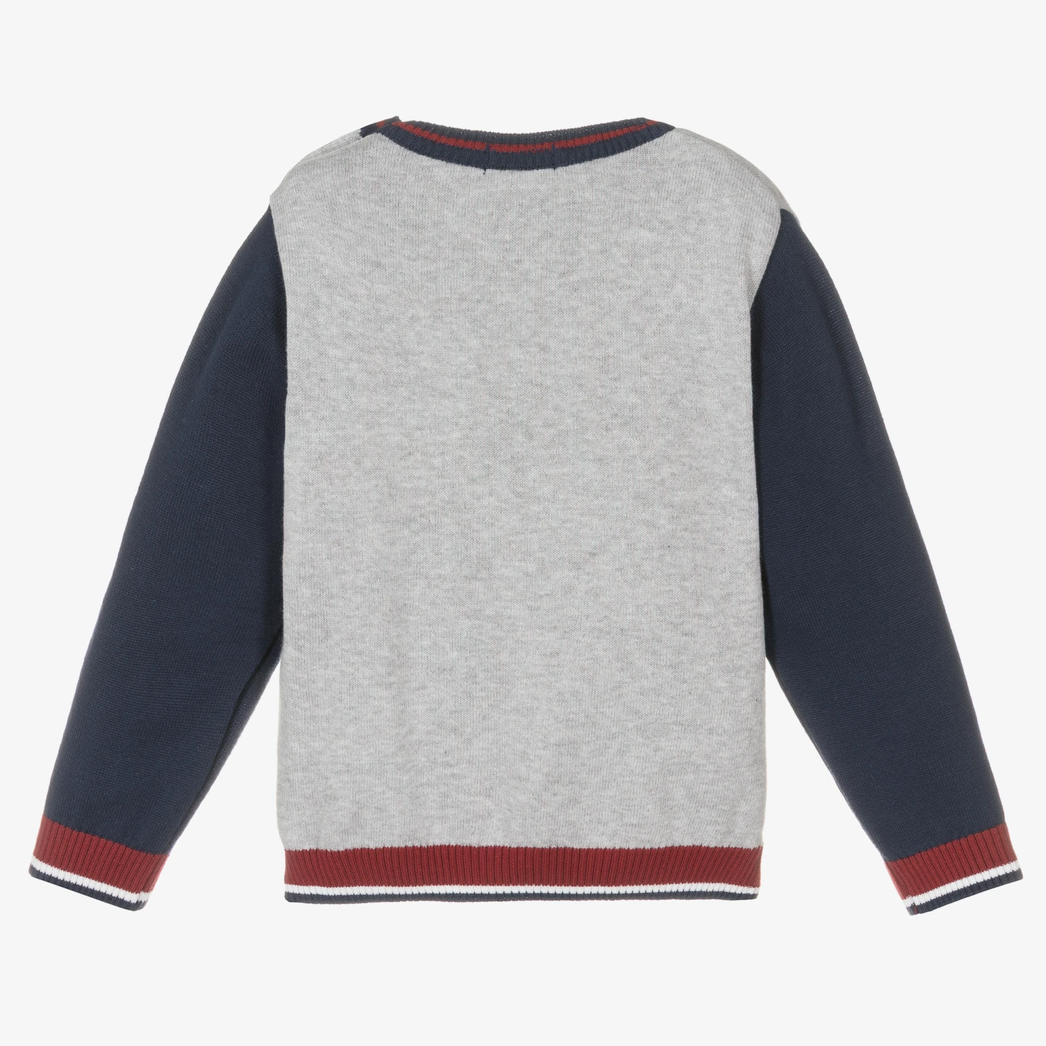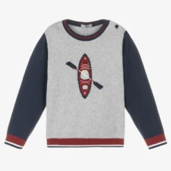In grey and navy blue, with red and white trims, this casual sweater for boys is by Dr. Kid. Cosy and comfy, it is knitted in soft cotton and fastens with buttons on one shoulder. There is a fun kayak and logo motif on the front