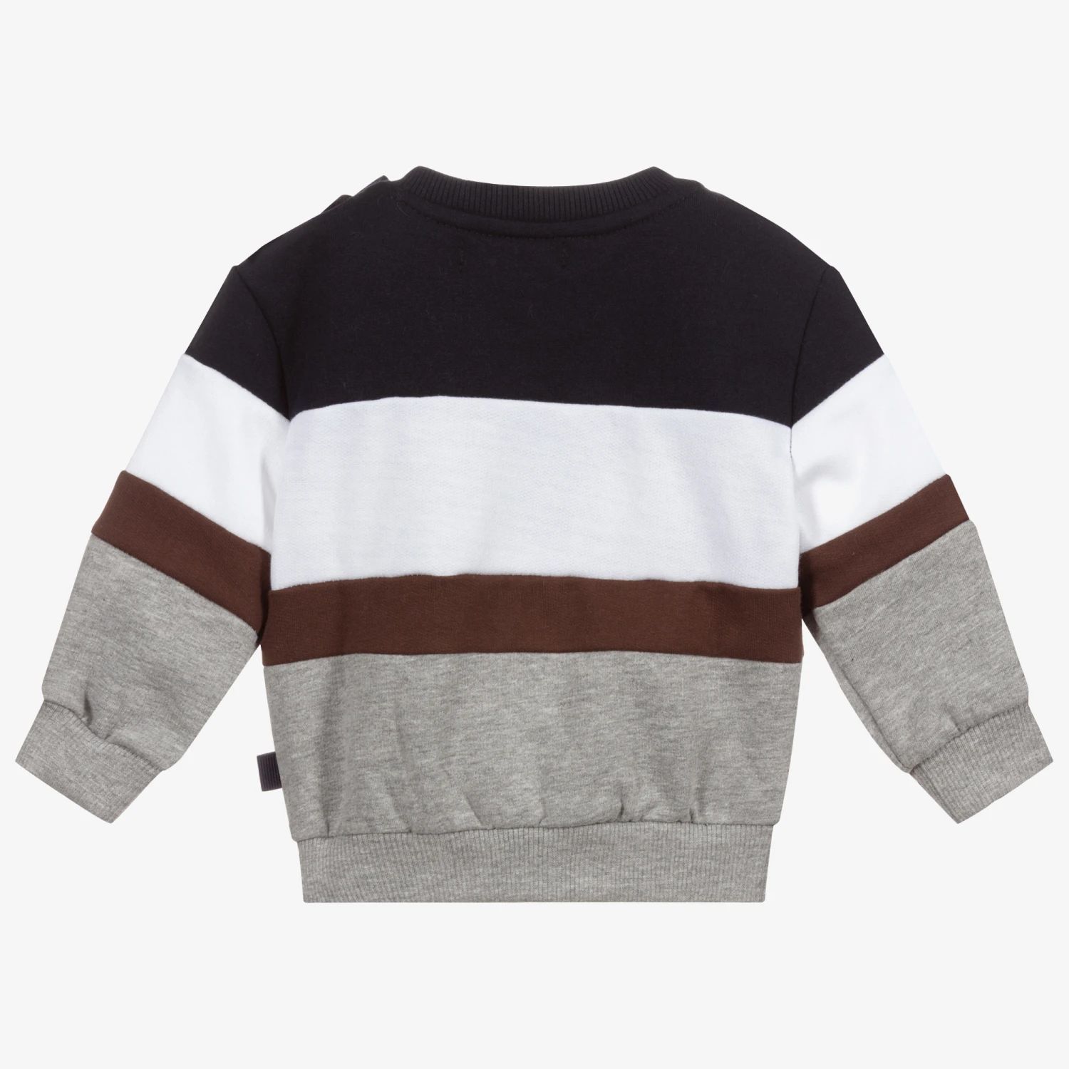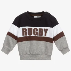 Colourblock sweatshirt for little boys by Dr. Kid, in grey, navy blue, white and brown. It is made in soft polycotton jersey, with a warm fleecy inside. It has ‘RUGBY’ in bold brown letters on the front.