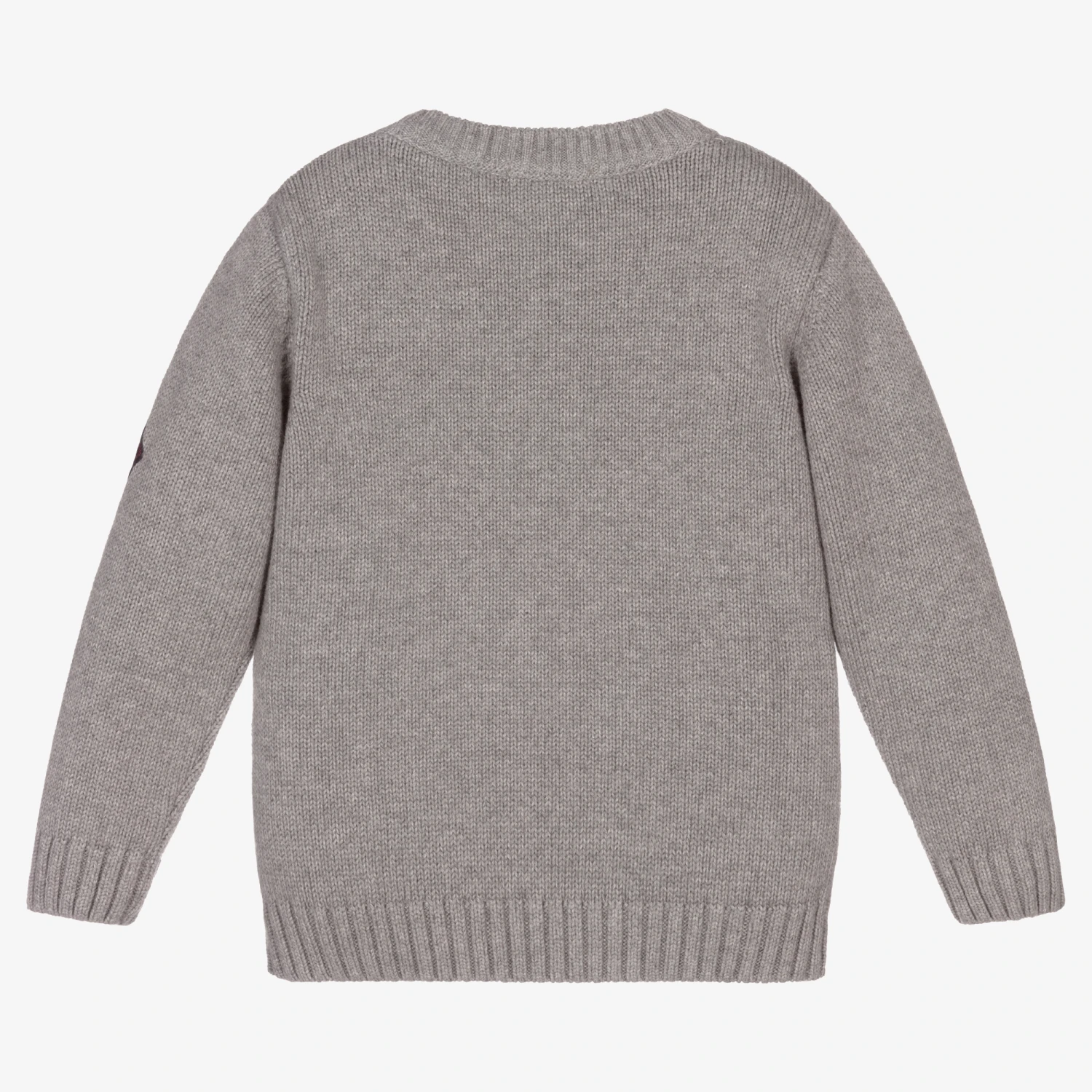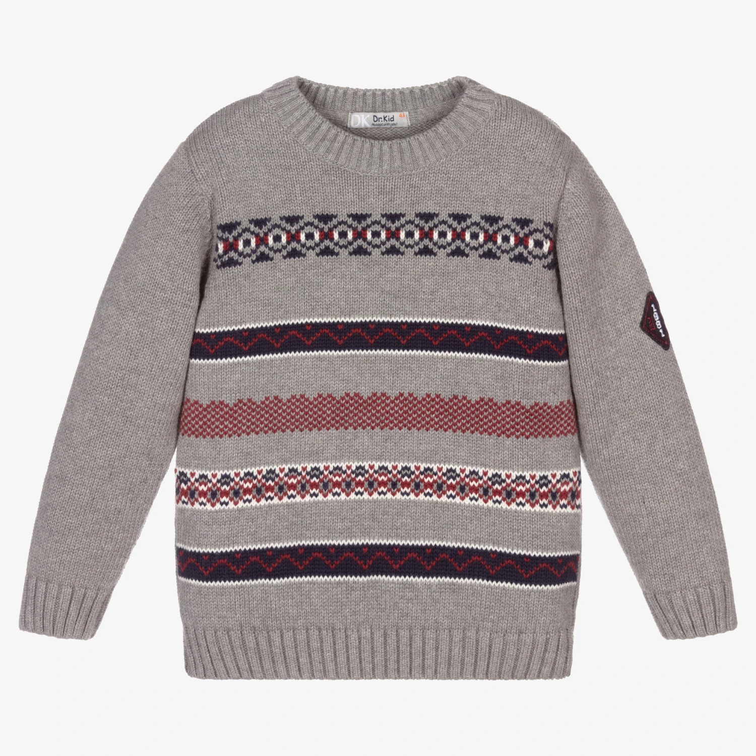 Grey knitted jumper for boys by Dr. Kid, with a striped pattern in blue, red and white. It is made in a soft cotton and wool blend and has an embroidered logo badge on one sleeve.