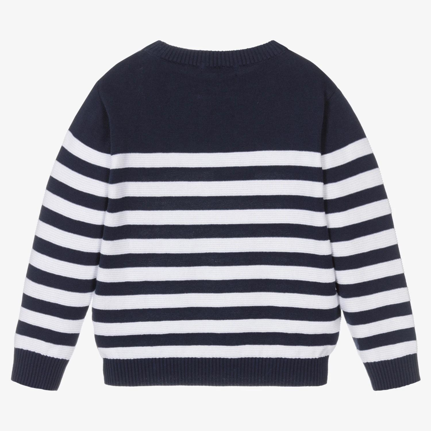 Lovely navy blue sweater for little boys by Dr. Kid, made in a super soft cotton knit. Comfortable to wear, it is designed in a classic crew neck style, with bold white ribbed stripes and stretchy ribbed trims. A fun ‘United States Coast Guard’ appliqué is on the front to complete the nautical-inspired look.