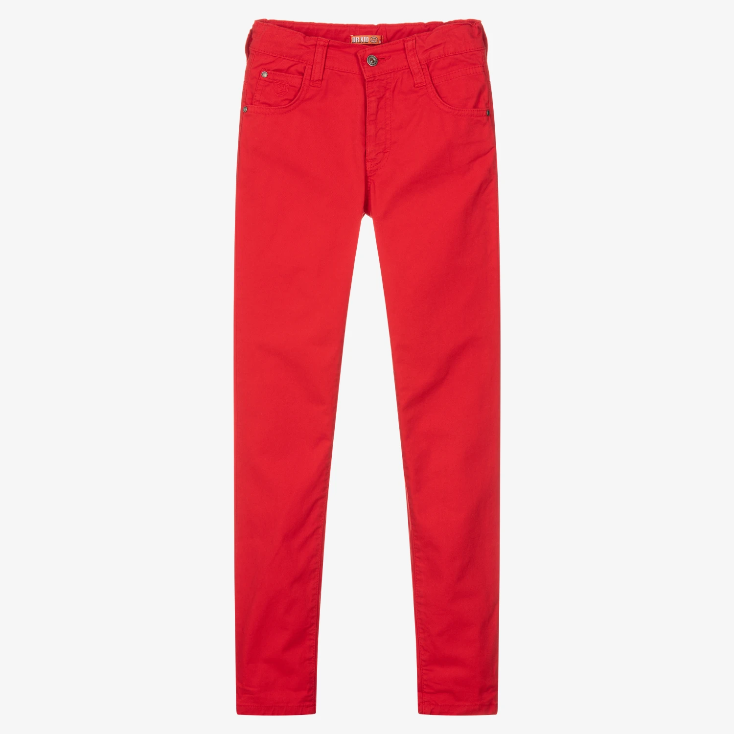 Red trousers for boys by Portuguese brand Dr. Kid, made in soft and lightweight twill with a slight stretch. Comfortable to wear, they have a button and zip fastening, classic five-pocket styling, and an adjustable waist to ensure a good fit. There is a tonal embroidered logo on the coin pocket, for a subtle designer finish.