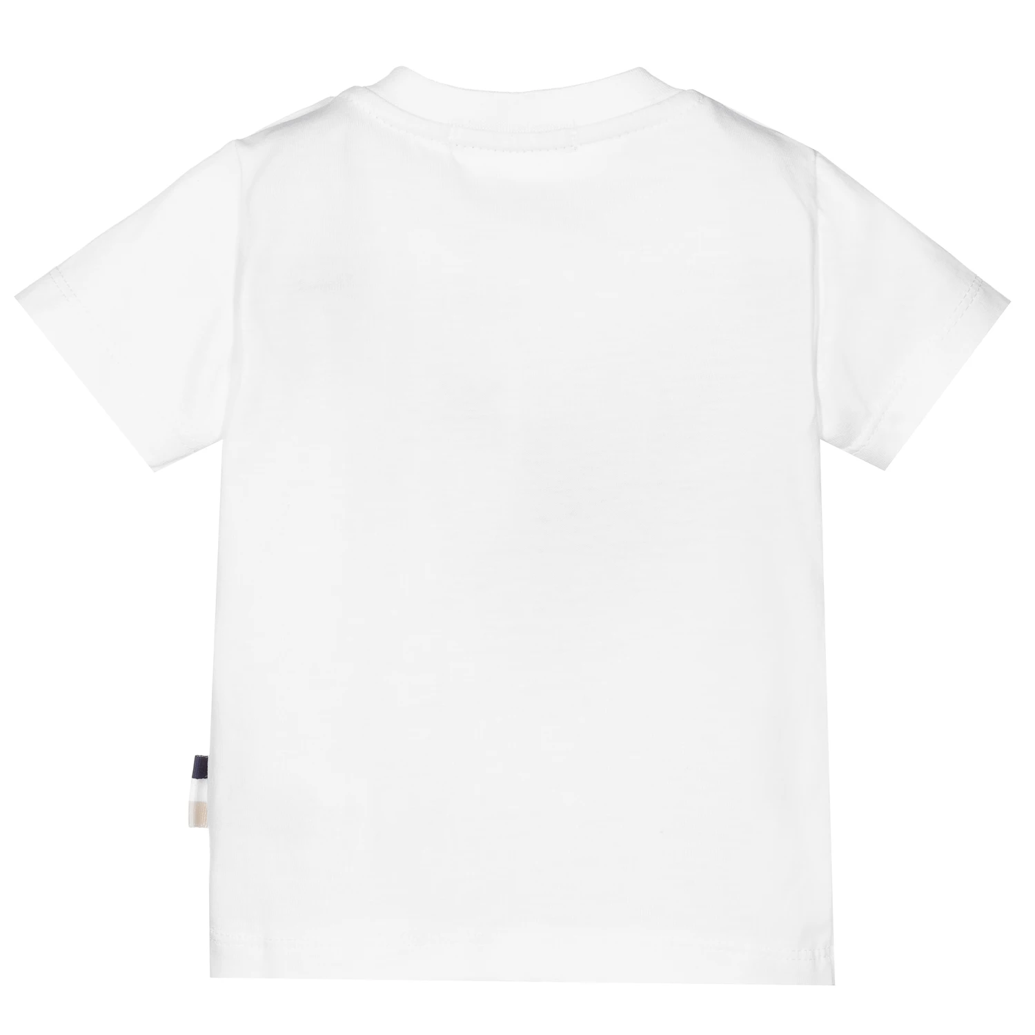 White cotton T-shirt for little boys by Dr. Kid, made in soft and stretchy cotton jersey. It has a sporting-themed print with blue embroidery, and popper fastenings on one shoulder.