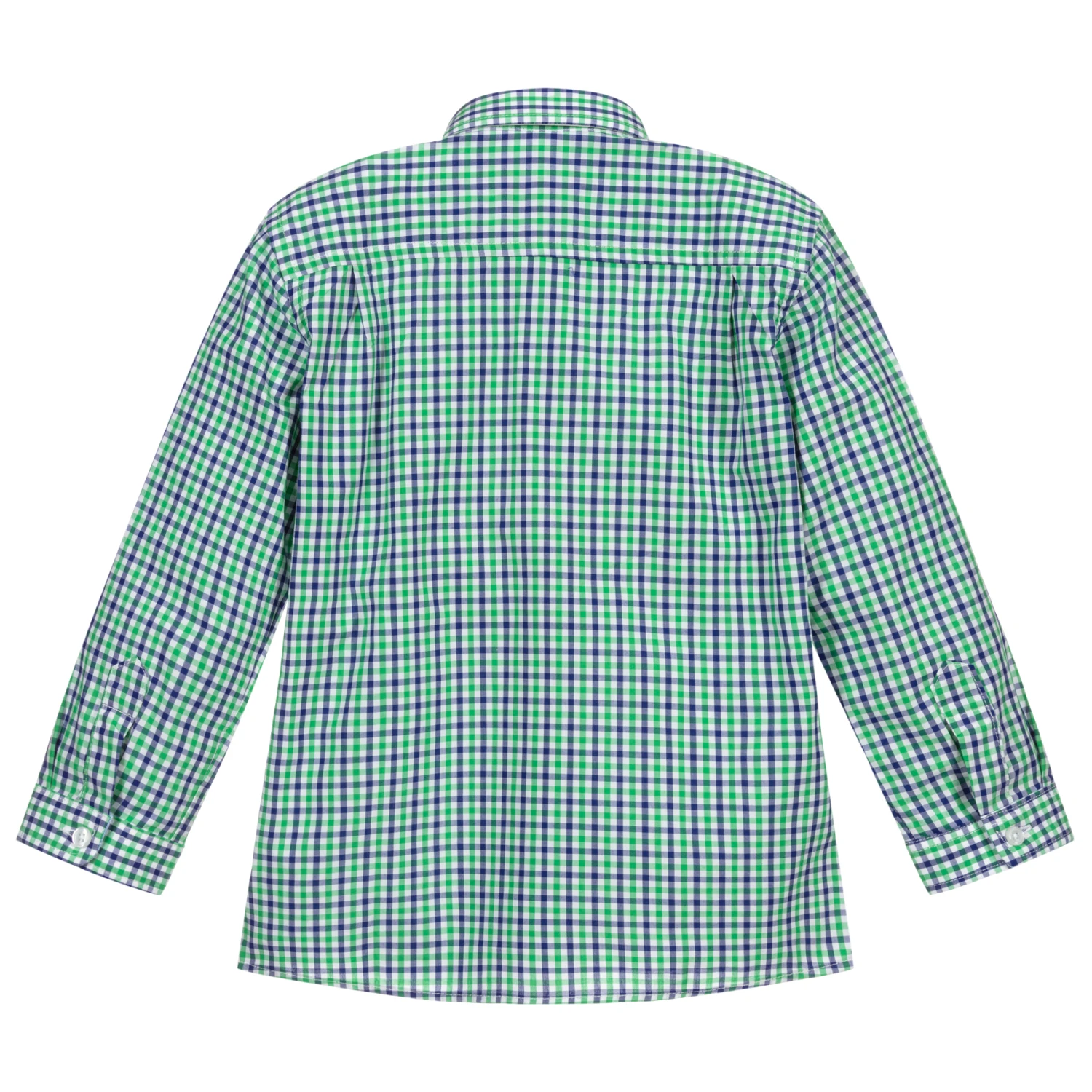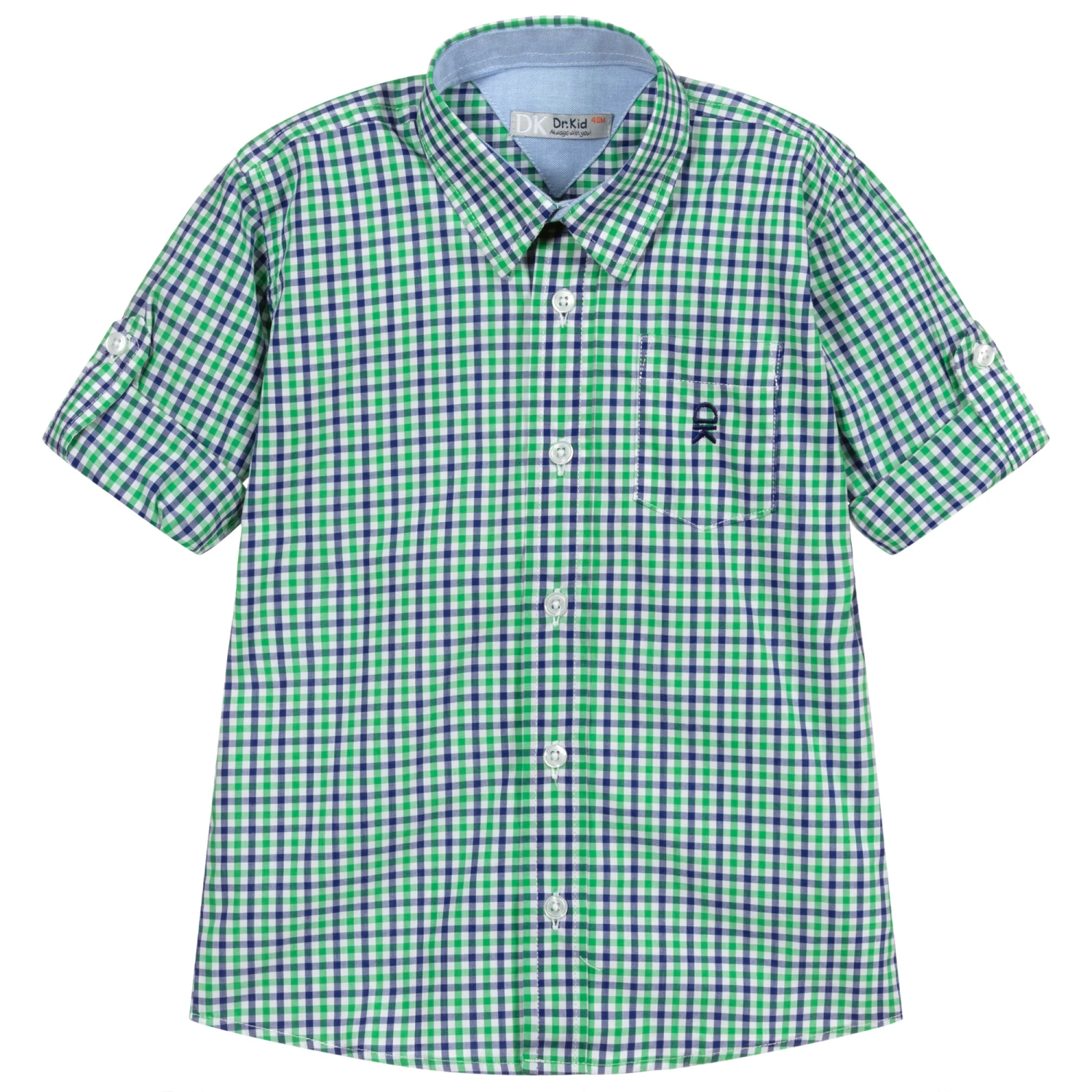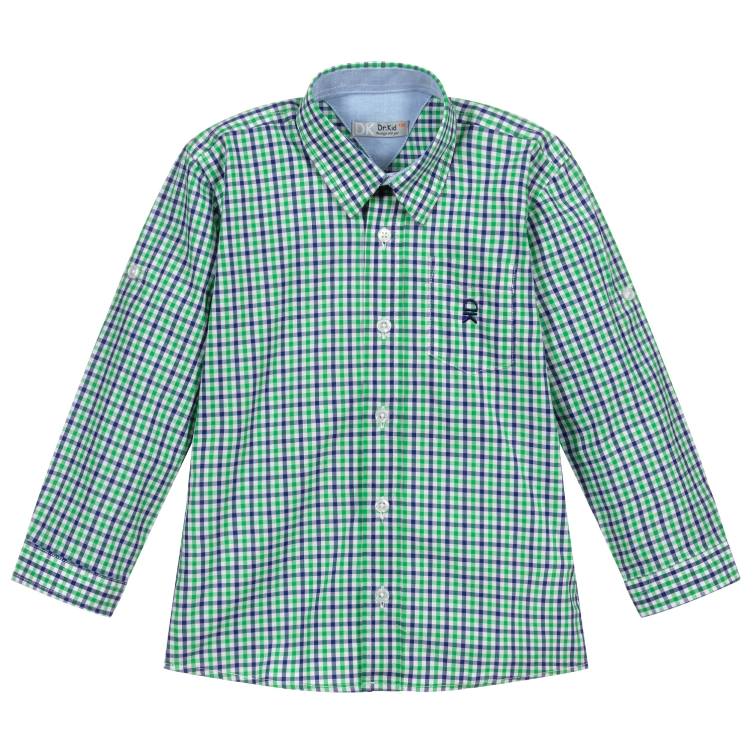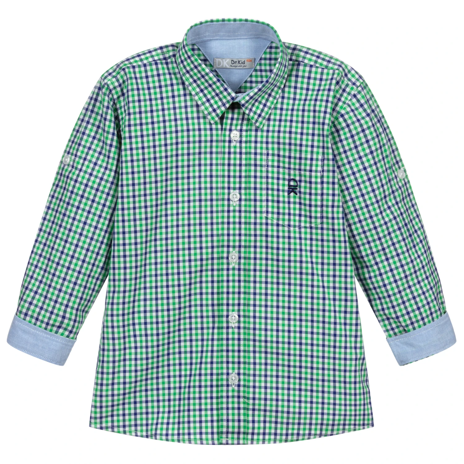 Green, navy blue and white checked shirt for boys by Dr. Kid. Made in smooth cotton, it has a patch pocket on the chest with navy blue logo embroidery.