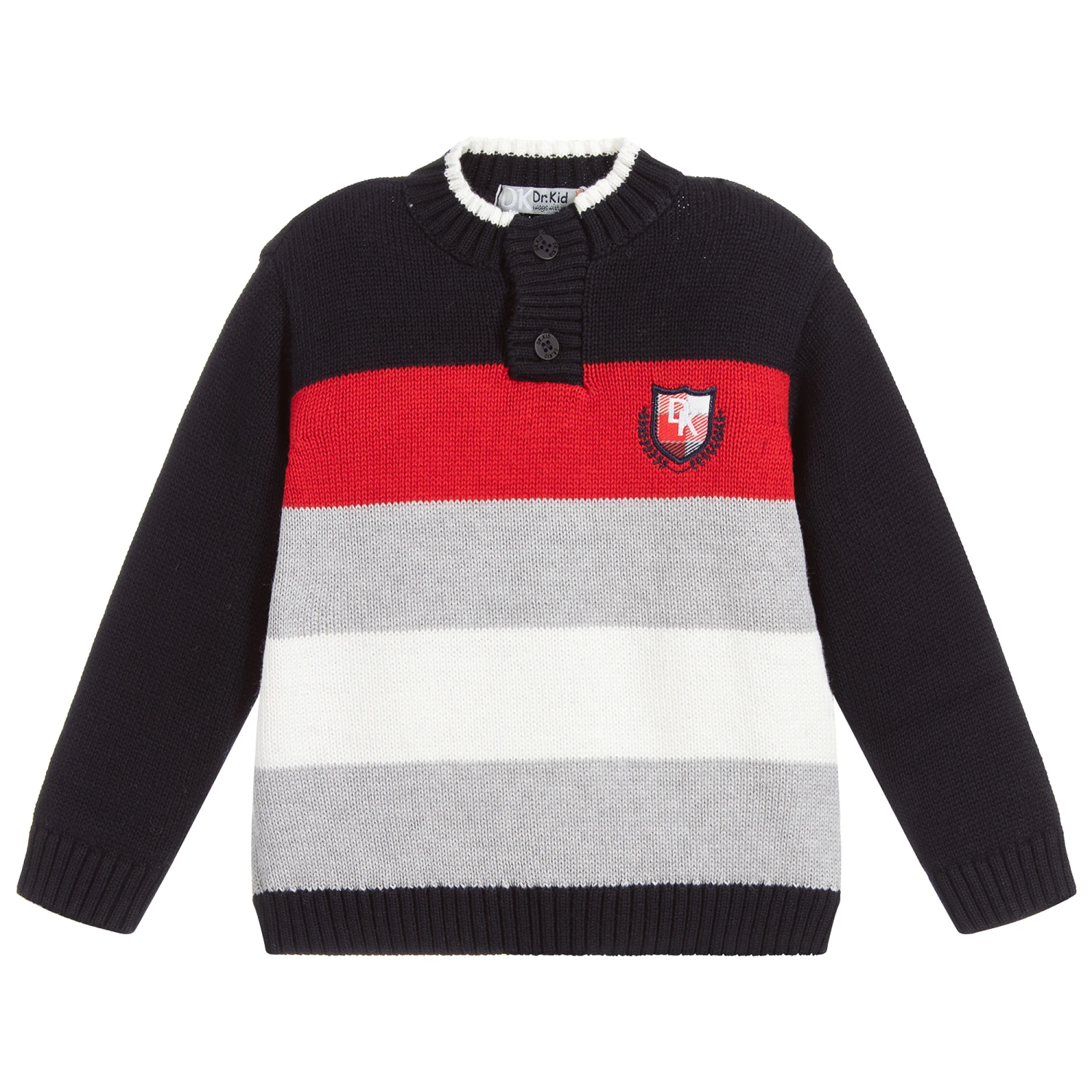 Designed by Dr. Kid, a navy blue sweater for boys with a red, white and grey striped pattern. This smart jumper is knitted from a soft cotton and wool and has stretchy ribbed trims. There is an embroidered ‘DK’ badge on the chest and knitted red elbow patches.