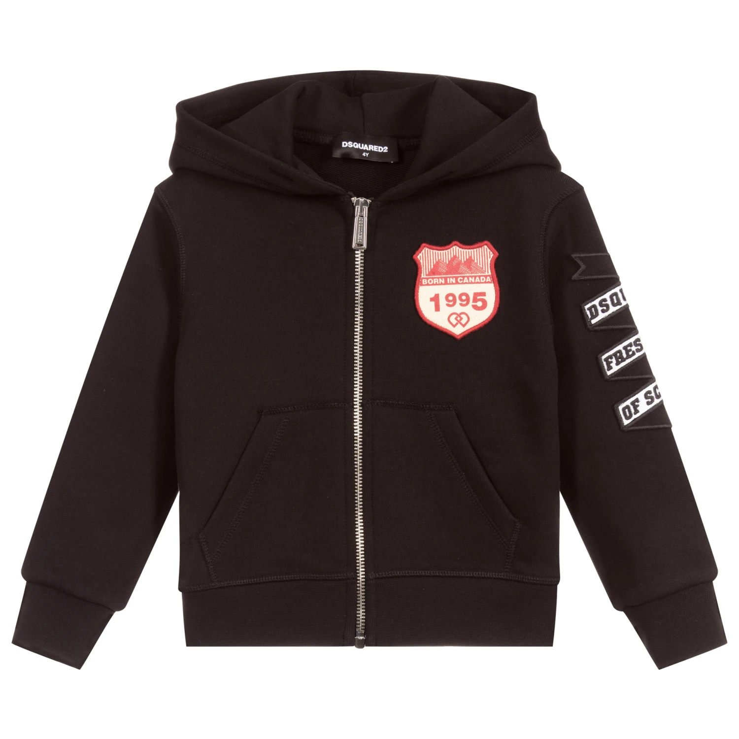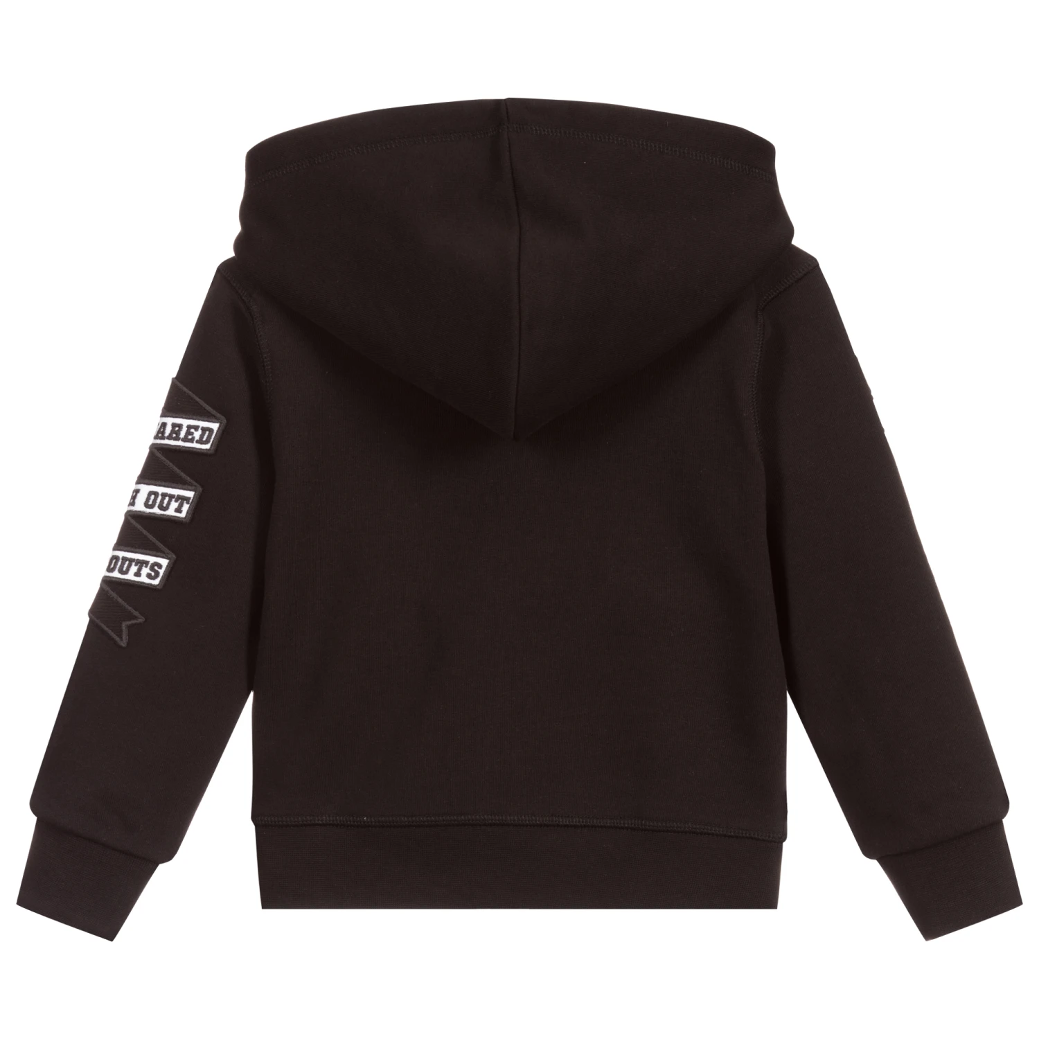 Black hooded zip-up top for boys by Dsquared2, made in mid-weight cotton jersey It has a pouch pocket, with logo appliqués in red, black and white.