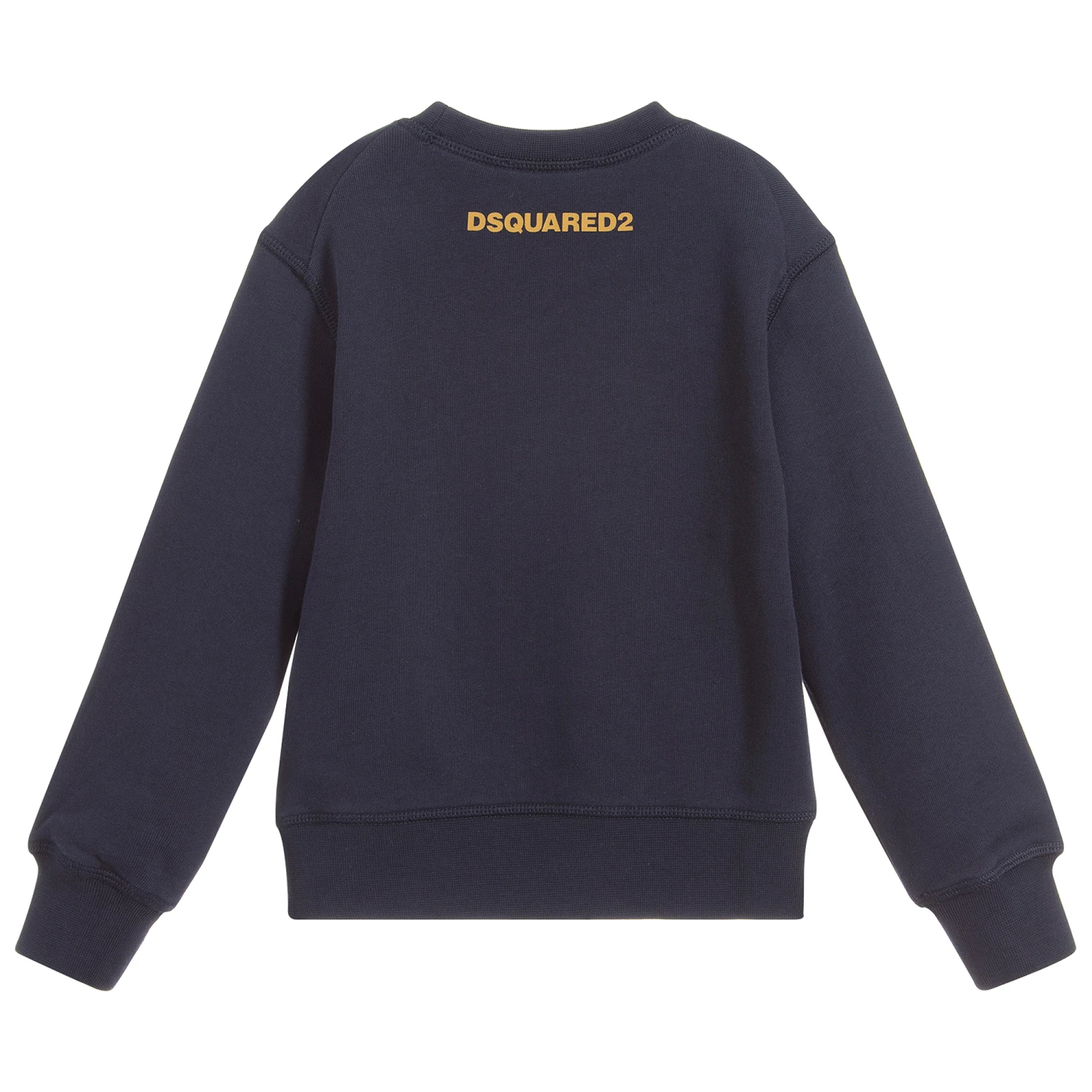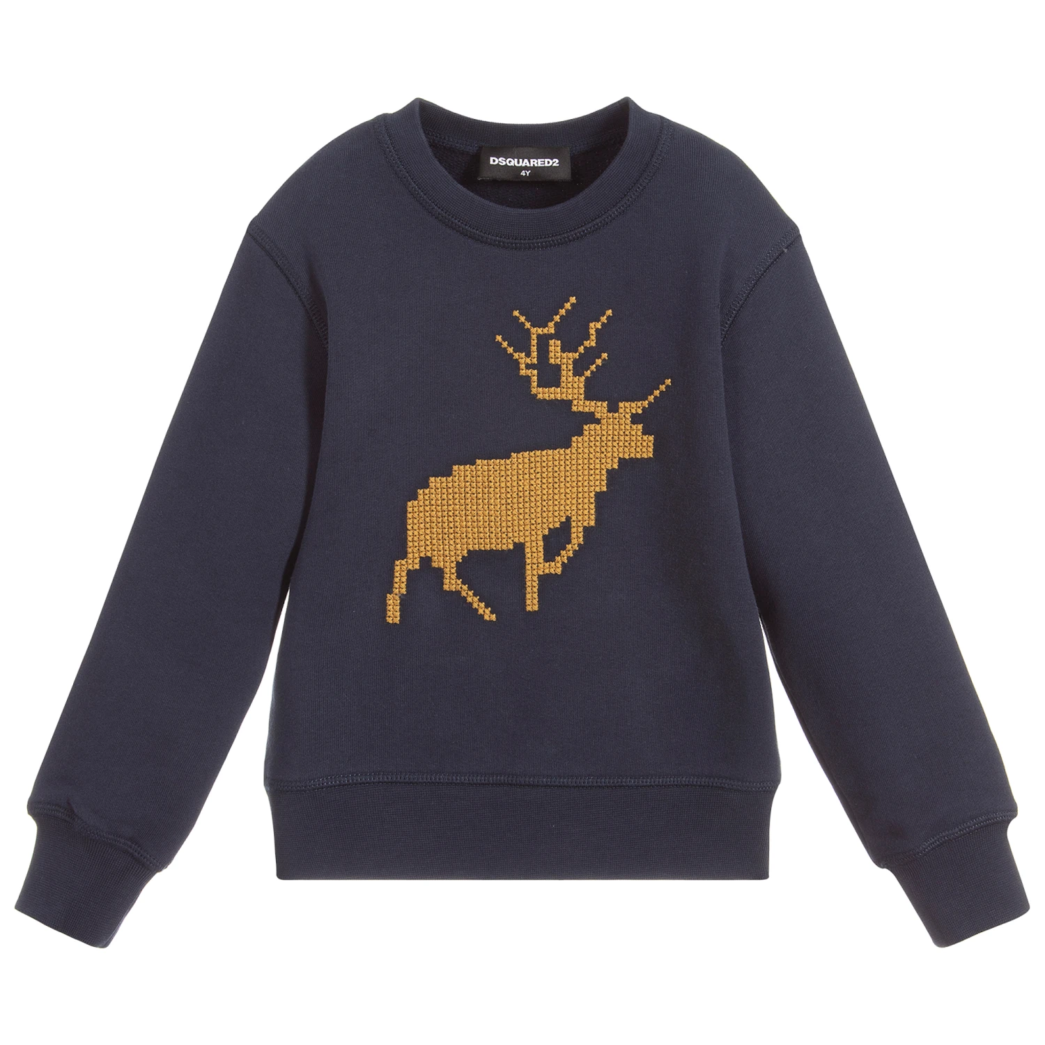 Navy blue cotton jersey sweatshirt for boys by Dsquared2. It has a brown embroidered reindeer on the front.