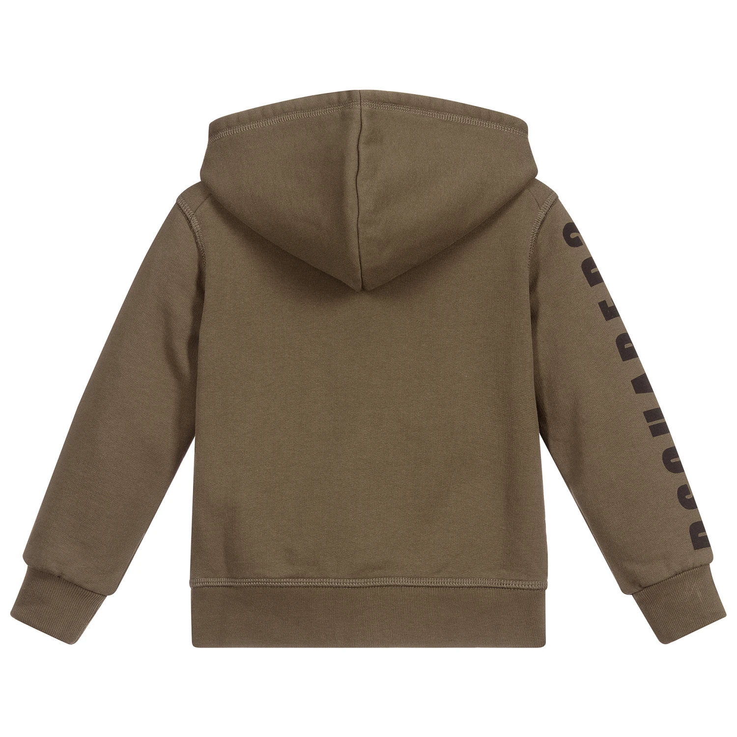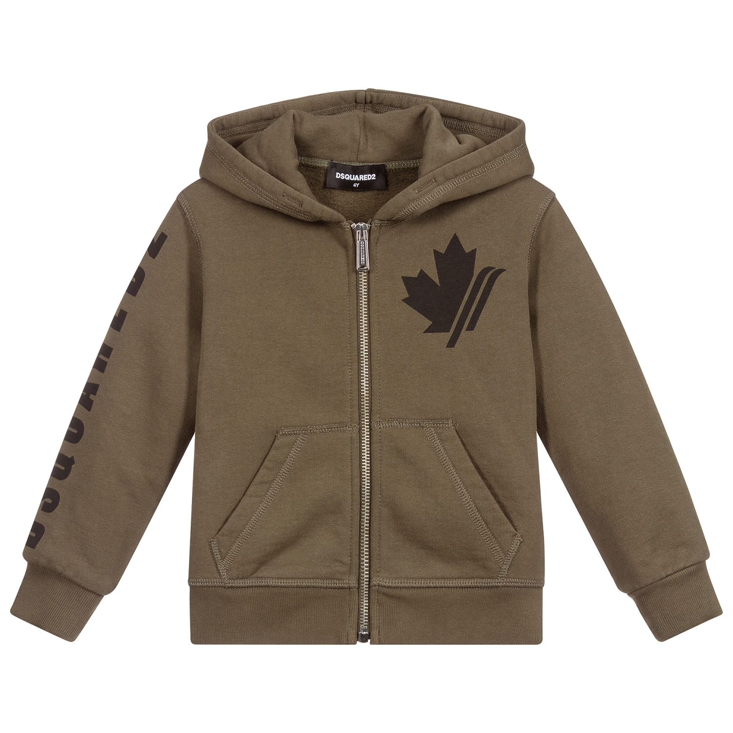 Khaki green cotton zip up hoodie for boys by Dsquared2. It has a pouch pocket on the front and black branding on the front and arms.