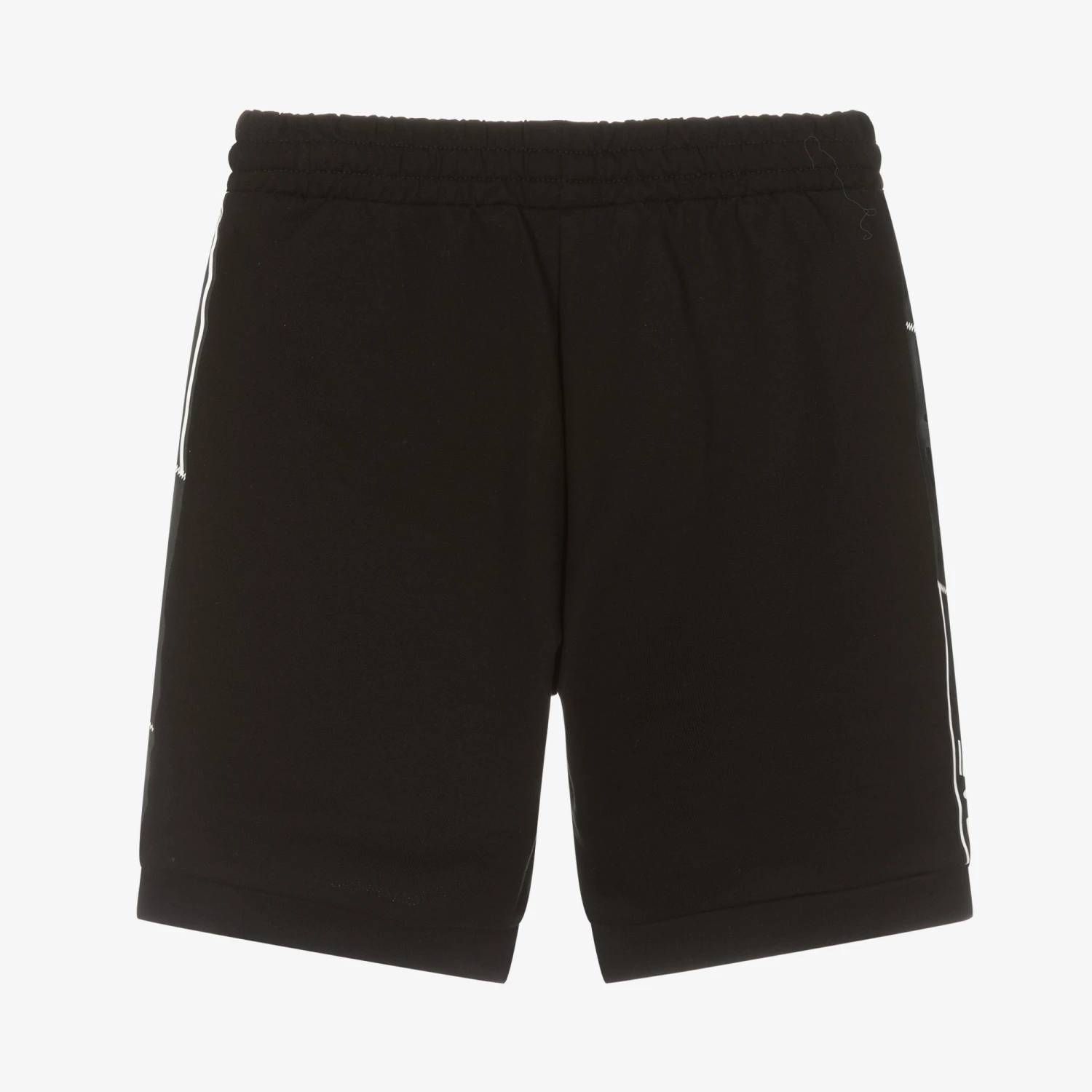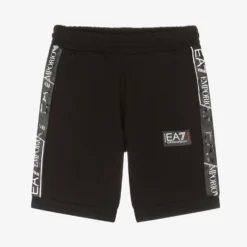 Black shorts for boys by EA7 Emporio Armani, made in the softest cotton jersey. Cool and contemporary, they feature a black EA7 logo on the leg, with sleek black taping down the sides. The pockets and internal drawstring waistband offer comfort to this casual style.