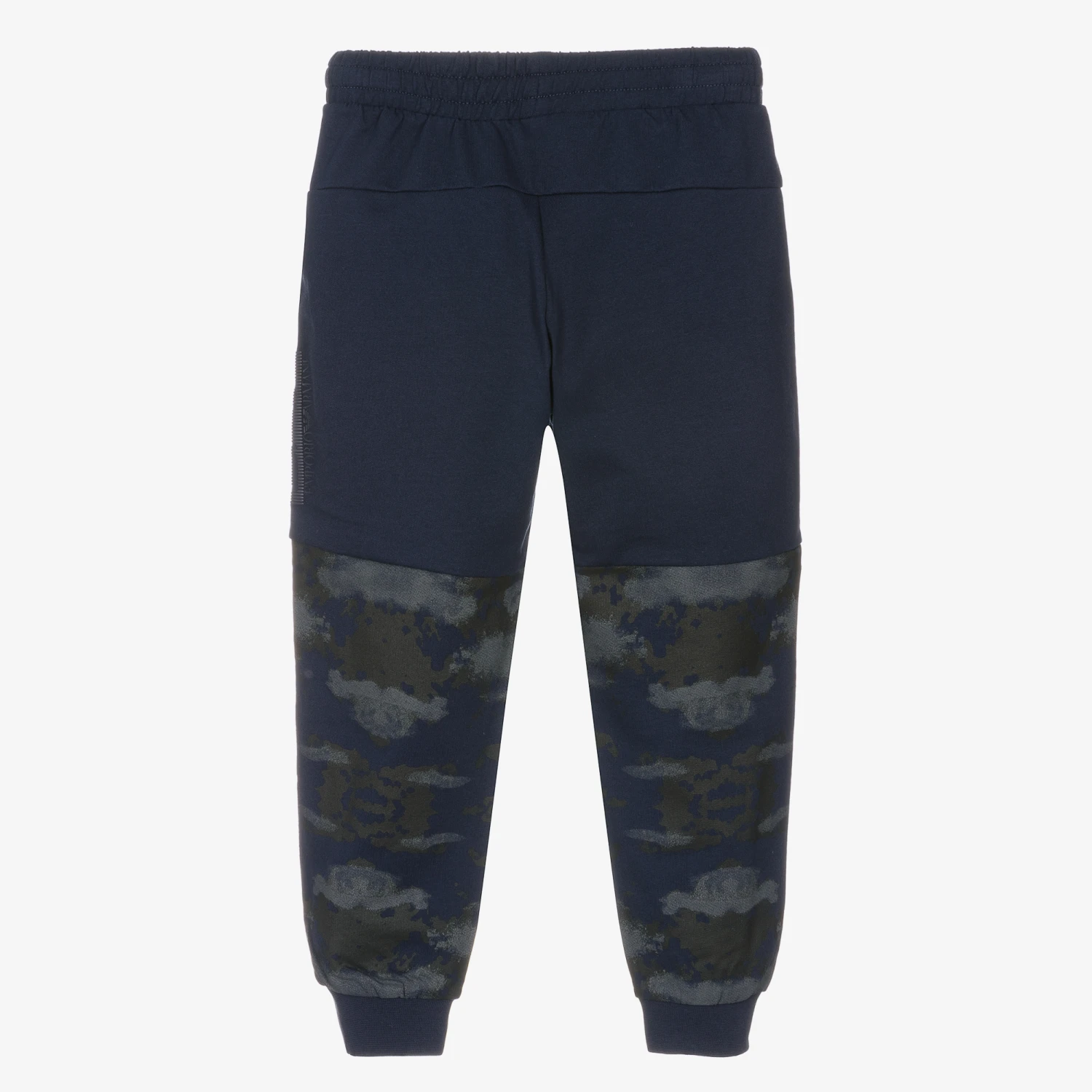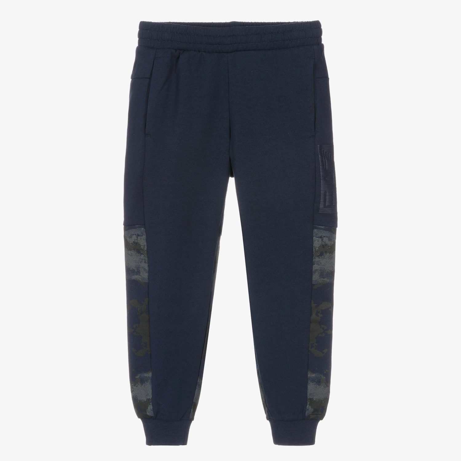 Navy blue cotton joggers for boys by Italian designer EA7 Emporio Armani, with camouflage panelling on the back and sides of the lower legs for a laid-back look. They have useful concealed side pockets, with the brand’s rubberised EA7 logo printed on one leg. Easy to wear, they are made in lightweight, comfortable jersey with an elasticated waistband and an inner drawstring for a good fit.