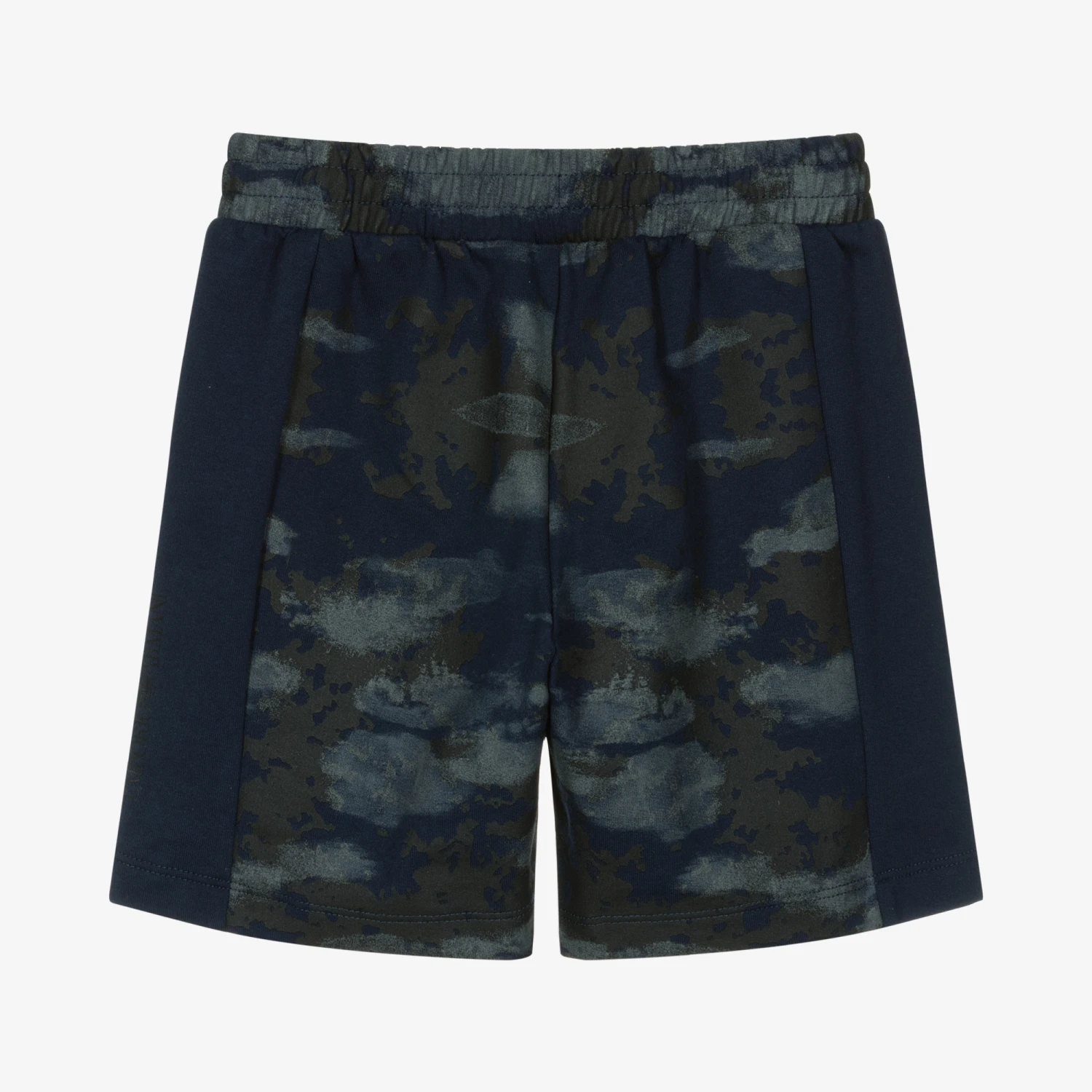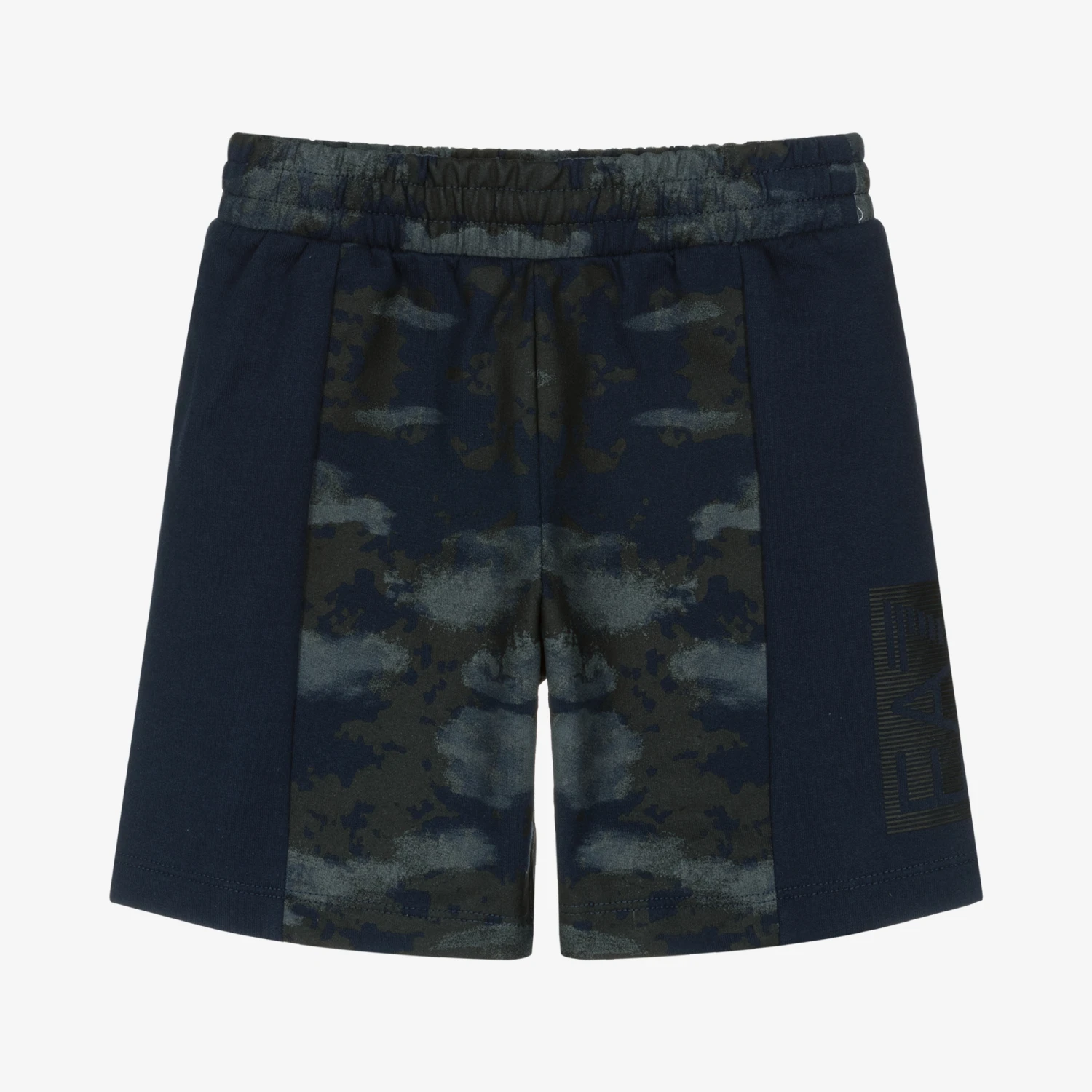Sporty navy blue and grey camouflage shorts for boys by Italian designer EA7 Emporio Armani, with a dark grey, rubberised logo on one leg. Made in comfortable cotton jersey, they have an elasticated waistband with an interior drawstring for a good fit.