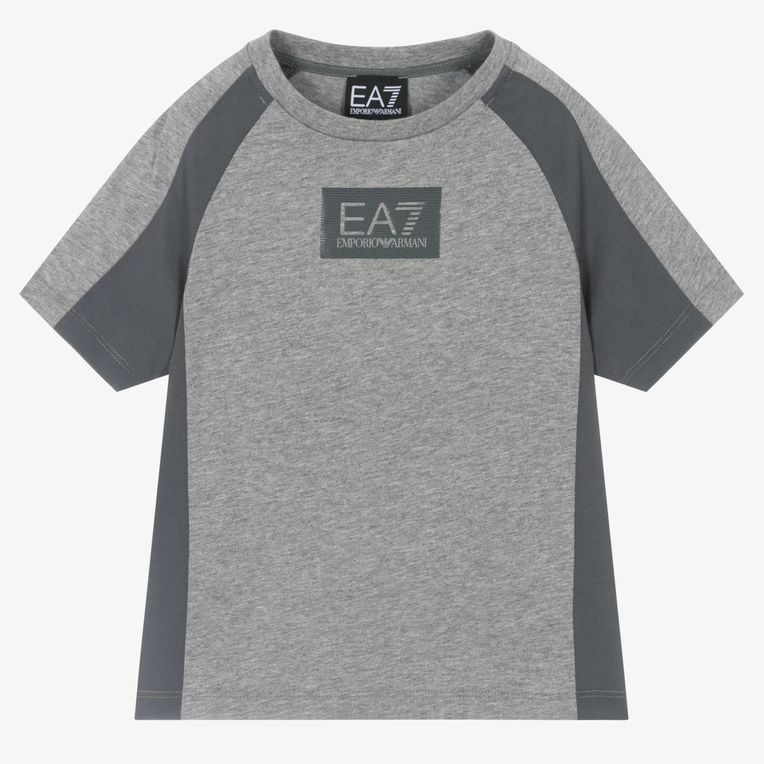 A grey marl T-shirt for boys by EA7 Emporio Armani, made in the softest cotton jersey. Cool and sporty, this top is printed with the iconic EA7 logo, and has dark grey panels down the sides.