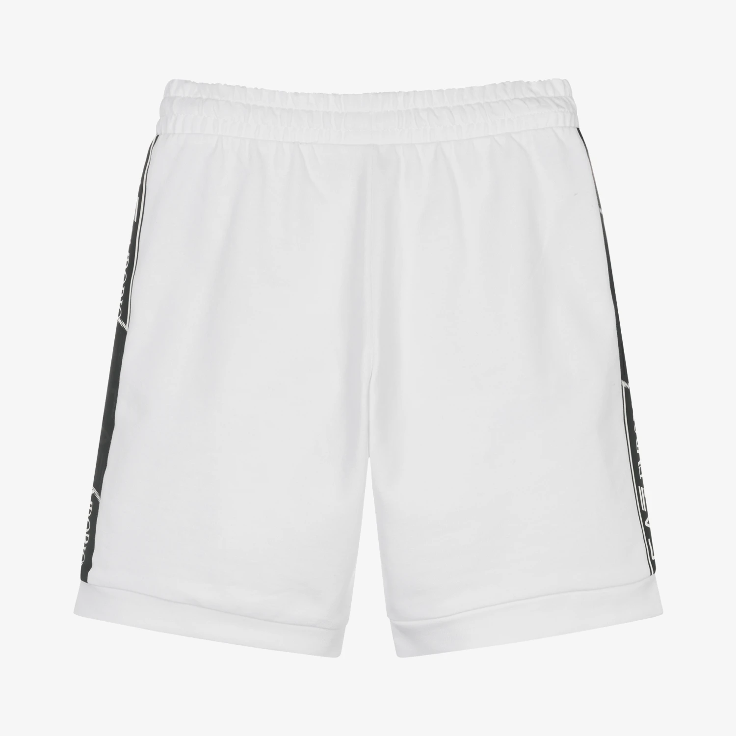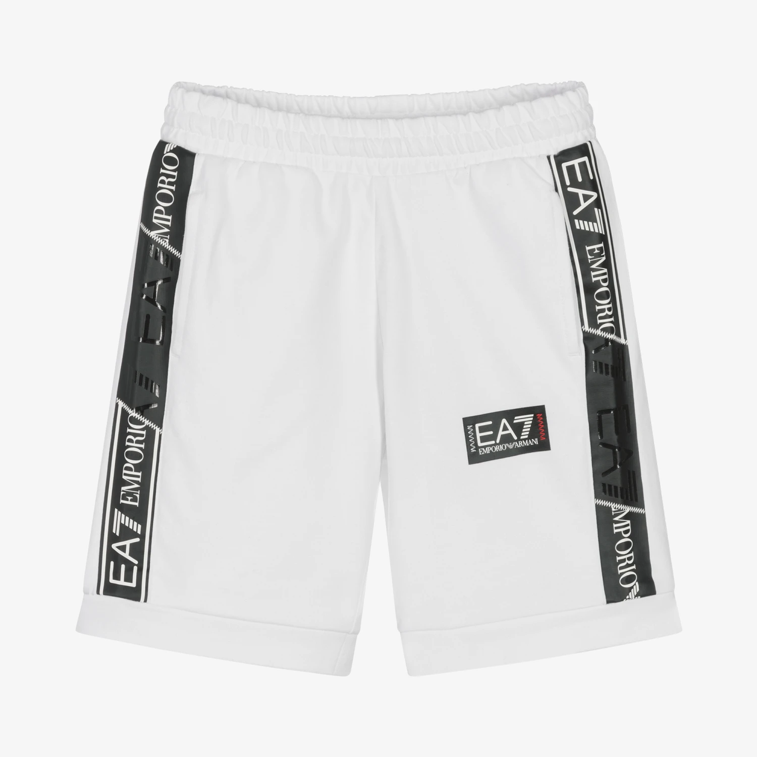White shorts for boys by EA7 Emporio Armani, made in the softest cotton jersey. Cool and contemporary, they feature a black EA7 logo on the leg, with sleek black taping down the sides. The pockets and internal drawstring waistband offer comfort to this casual style.