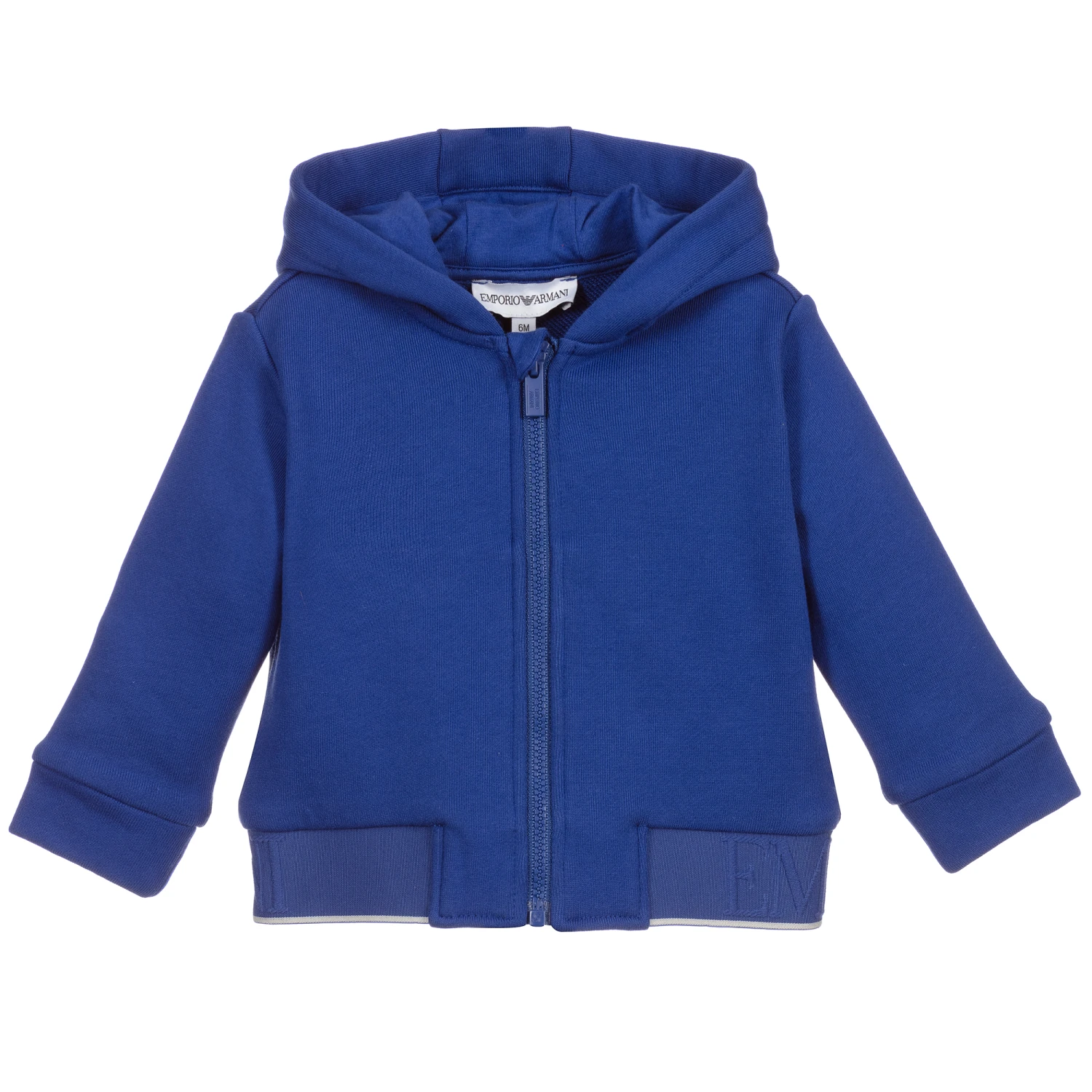 Blue zip-up top for little boys by Emporio Armani, made in soft and stretchy cotton sweatshirt jersey. There is an elasticated hem, with an embossed Emporio Armani logo trim and two side pockets.