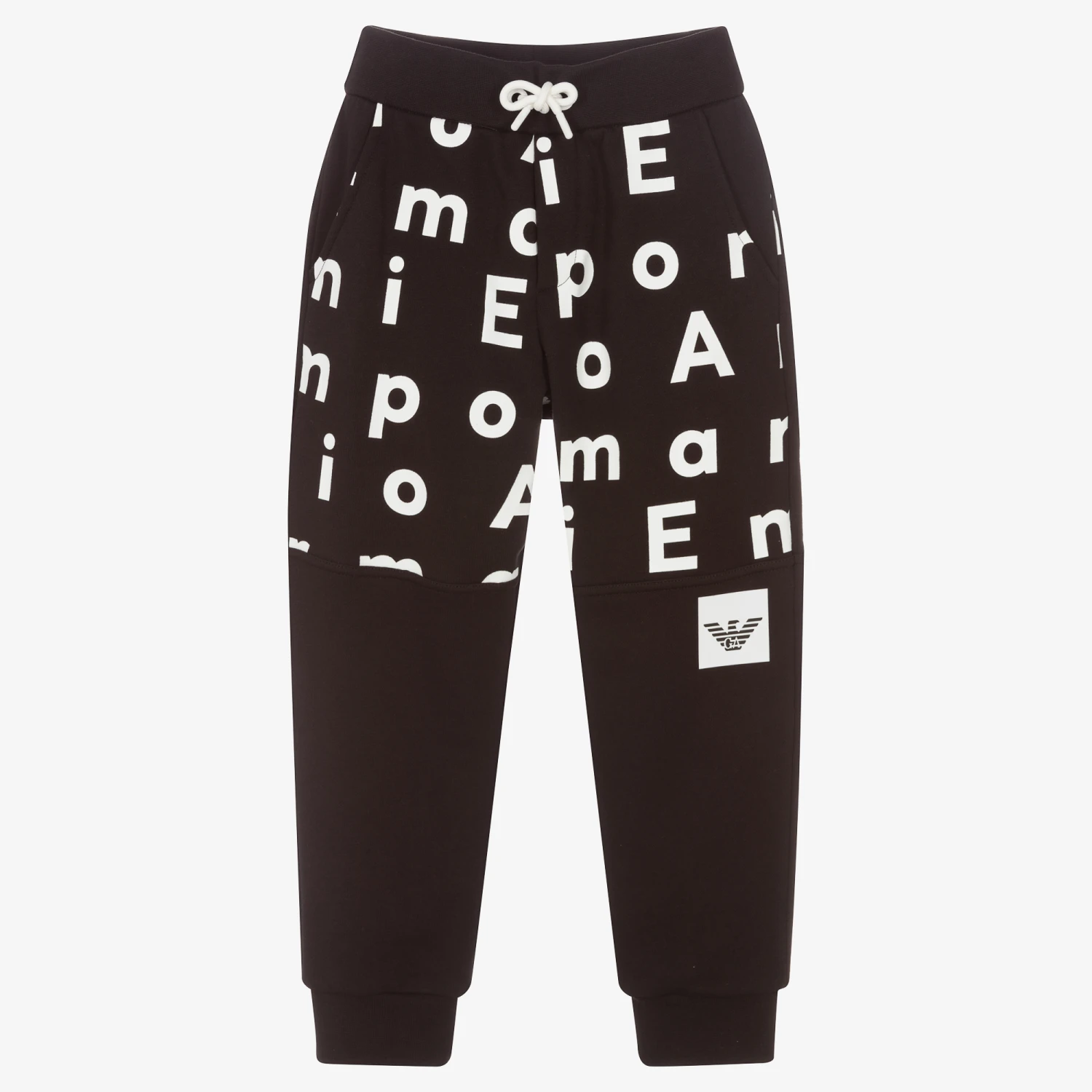 Black joggers for boys and girls by Emporio Armani, made in soft mid-weight cotton jersey with a fleecy inside. Part of the EA Crew Capsule, they have an all over white logo print around the top half, with a black and white Eagle logo print on one leg. There are slanted front pockets and an elasticated waistband with a faux drawstring.
