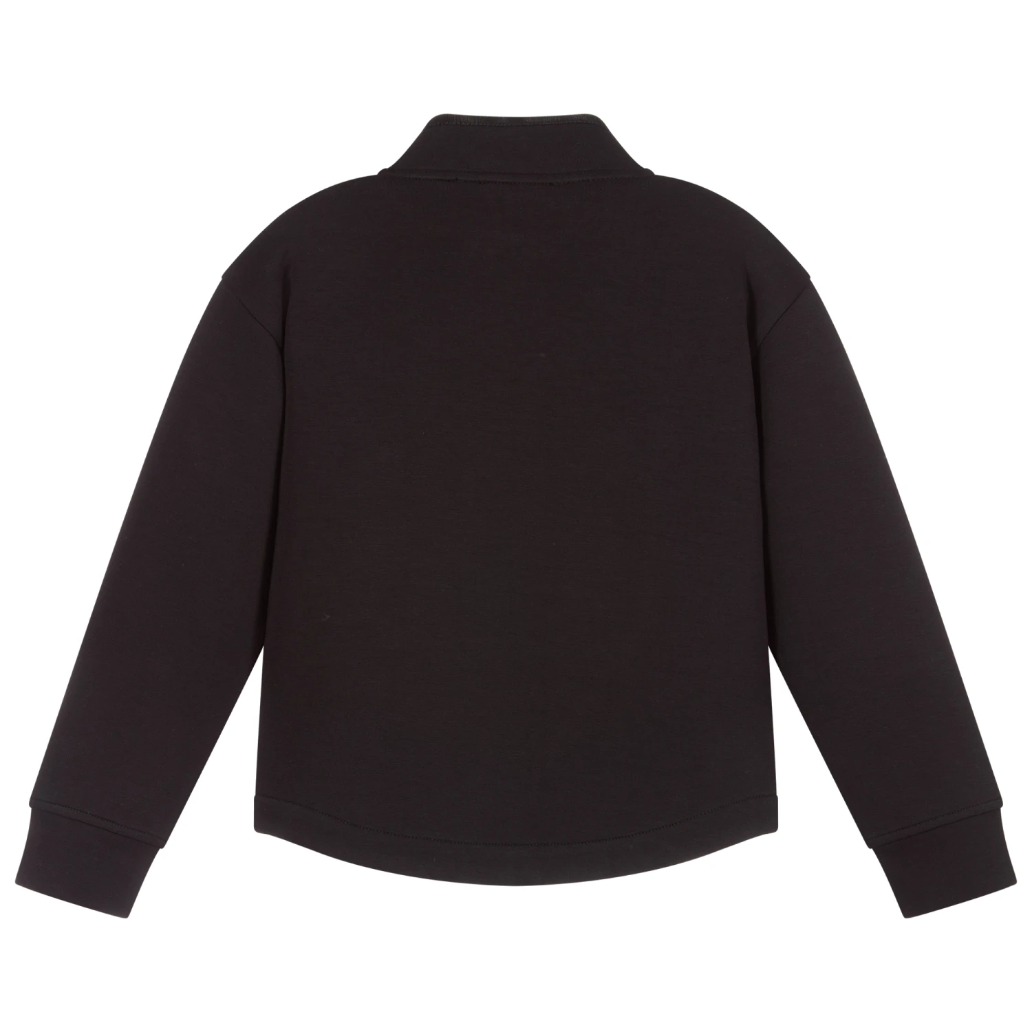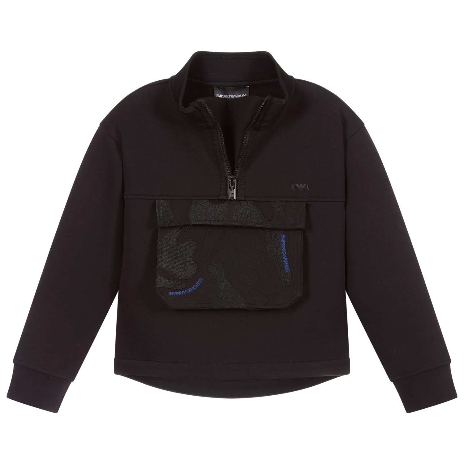 Boys black, half-zip turtle neck top by Emporio Armani. Super soft, it is made in a polyester and viscose blend jersey. The pocket on the front is embroidered in a camouflage pattern with blue logos and fastens with poppers. There is a black rubberised Eagle logo on the chest.