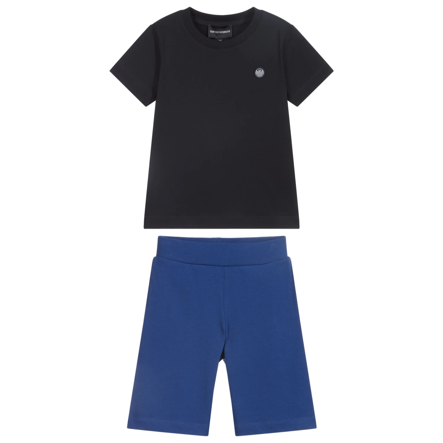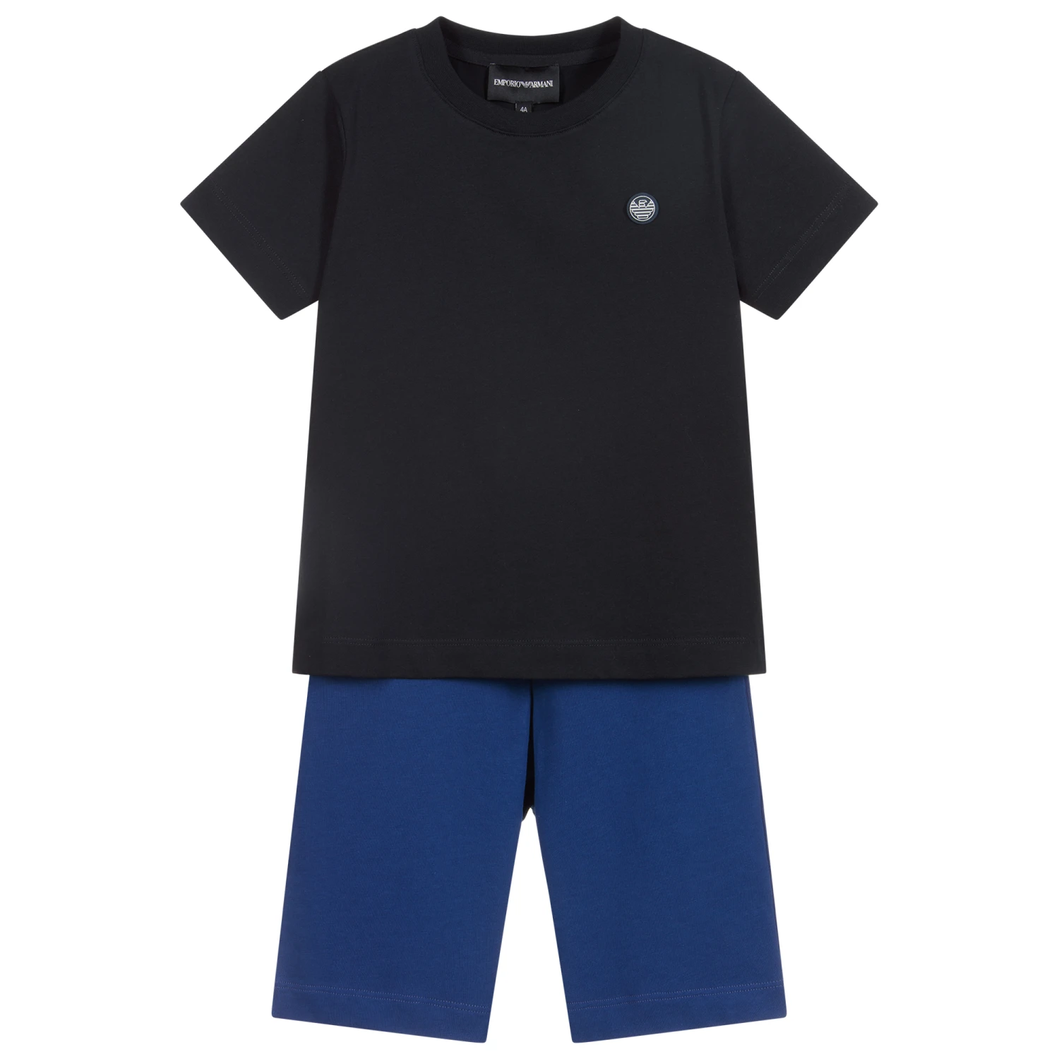 Boys T-shirt and shorts set by Emporio Armani, made in lightweight cotton jersey. The black T-shirt has a rubber logo plaque, and the royal blue shorts have an elasticated waistband and a rubber logo on the back pocket.