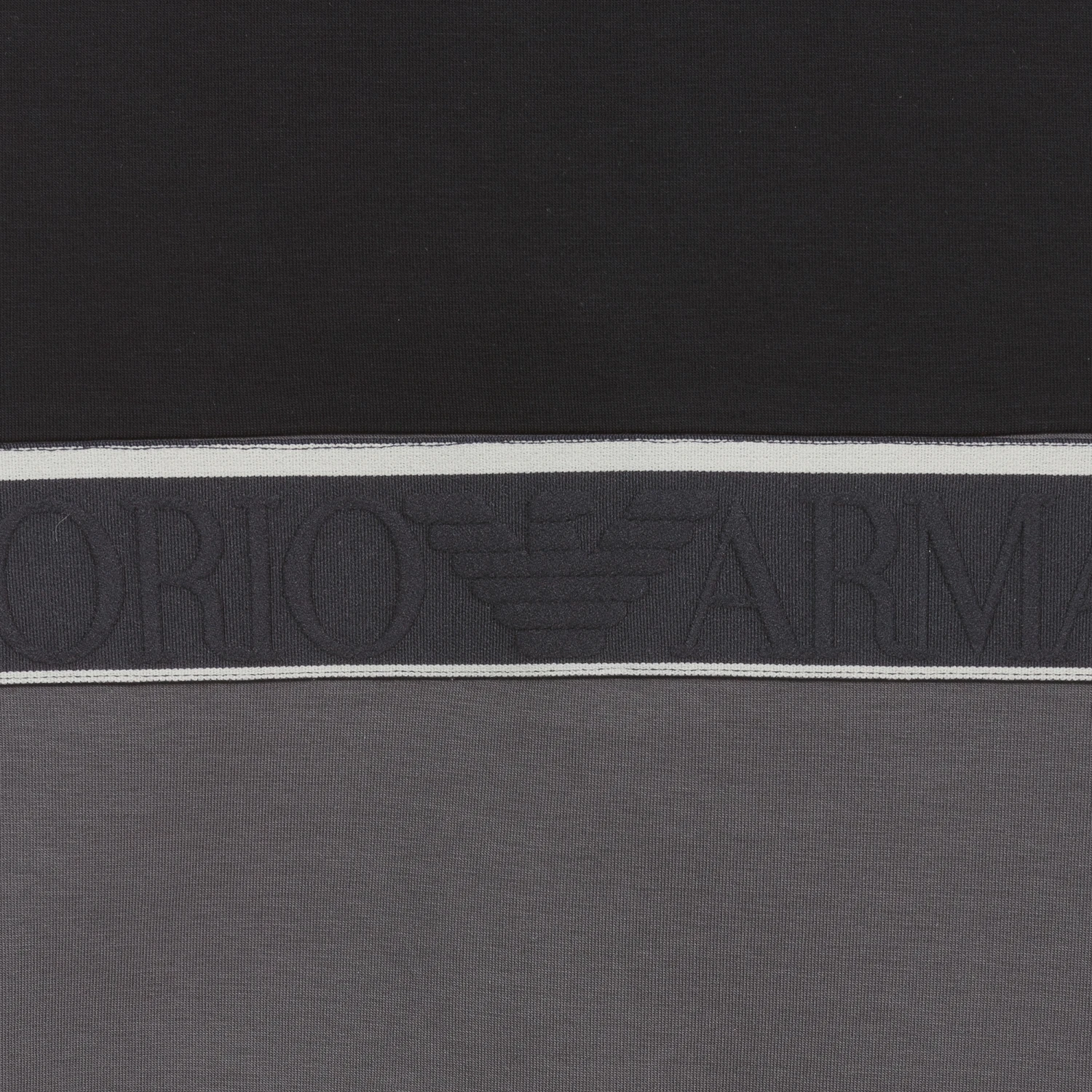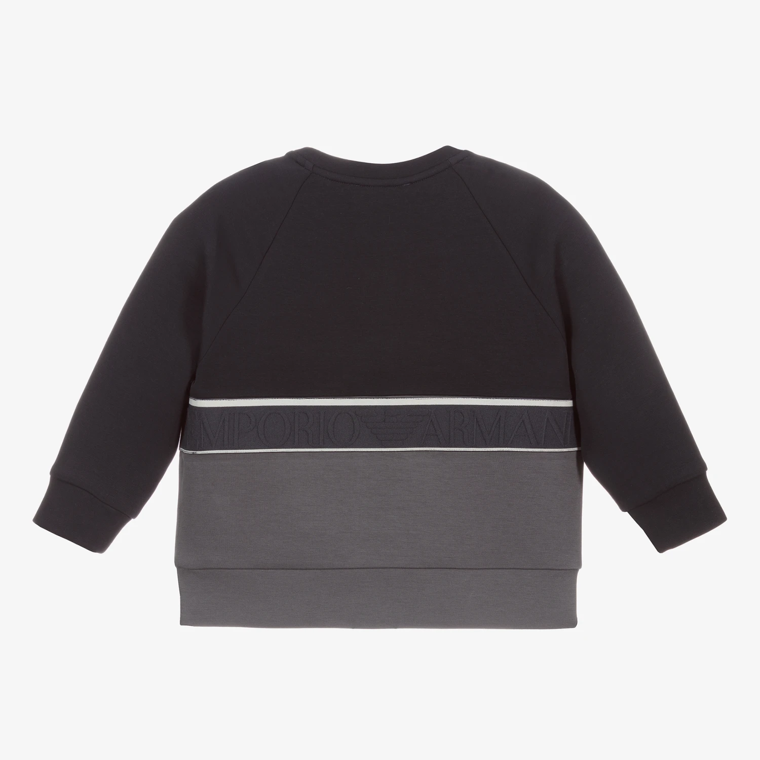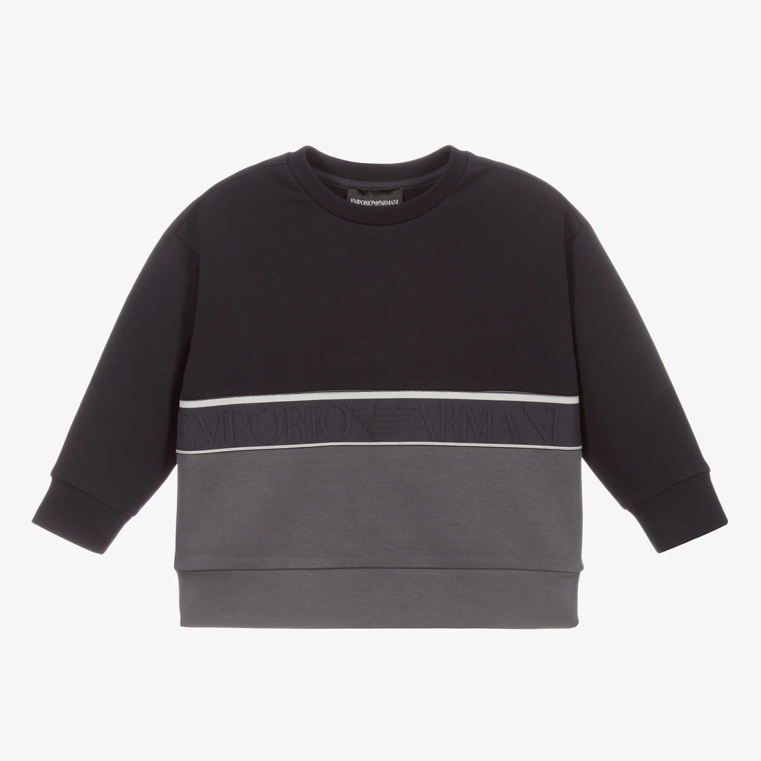 Boys navy blue and grey sweatshirt from luxury designer Emporio Armani. It is made in super-soft Milano jersey with a slightly wider shape. There is a grey and ivory elasticated band across the front, with a repeated jaquard Emporio Armani logo.