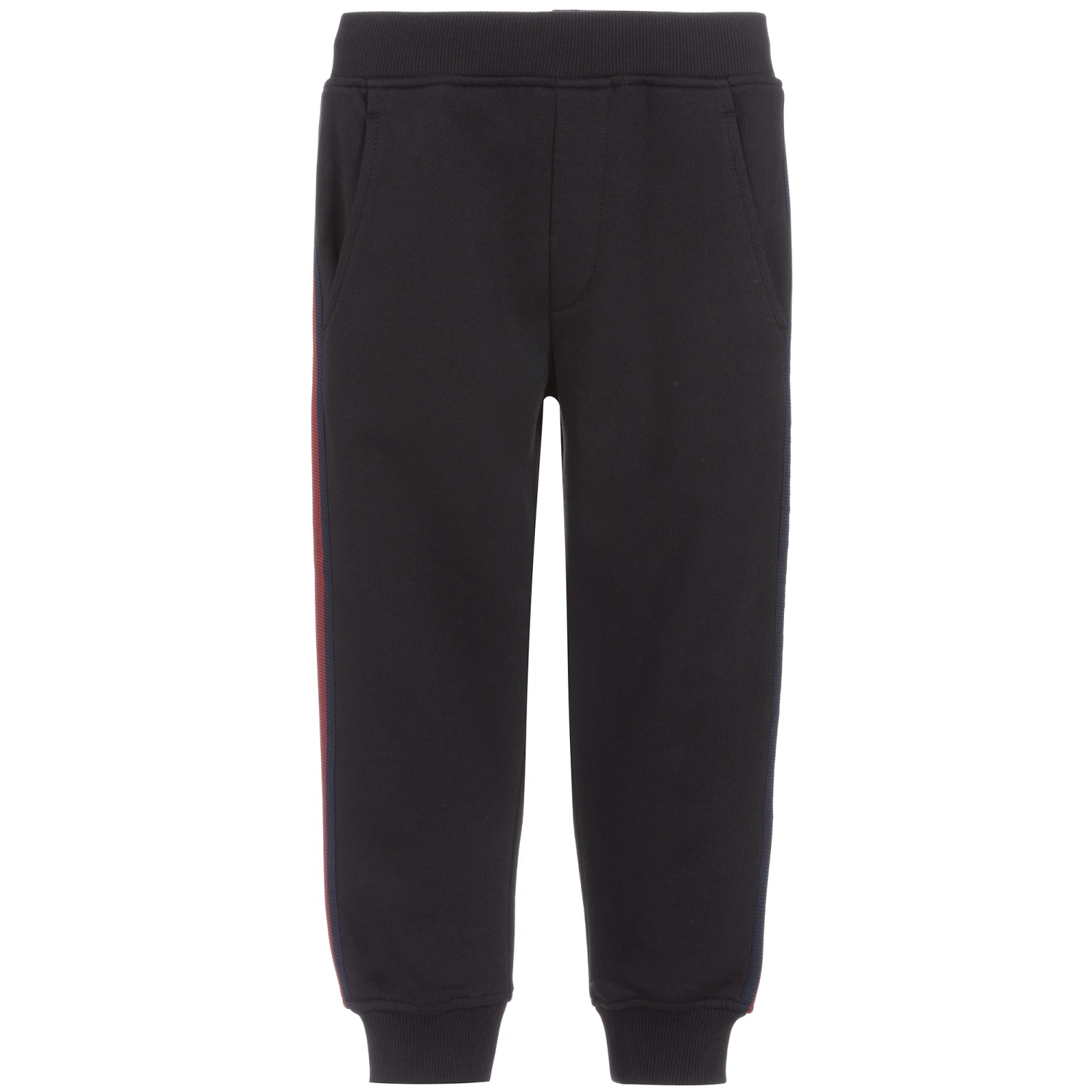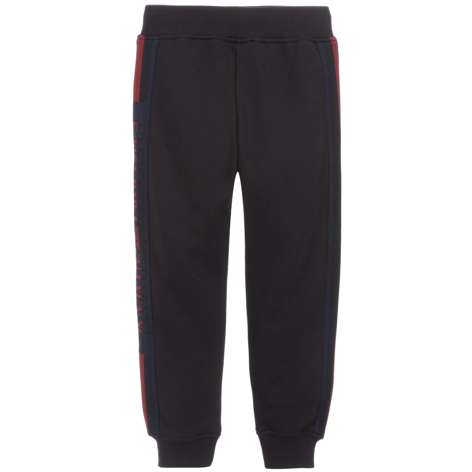 Navy blue joggers for boys by Emporio Armani, made in soft and stretchy loopback cotton jersey. There is red and blue taping on each leg with the Emporio Armani logo and two side pockets. The ribbed waistband is gently elasticated for a comfortable fit.