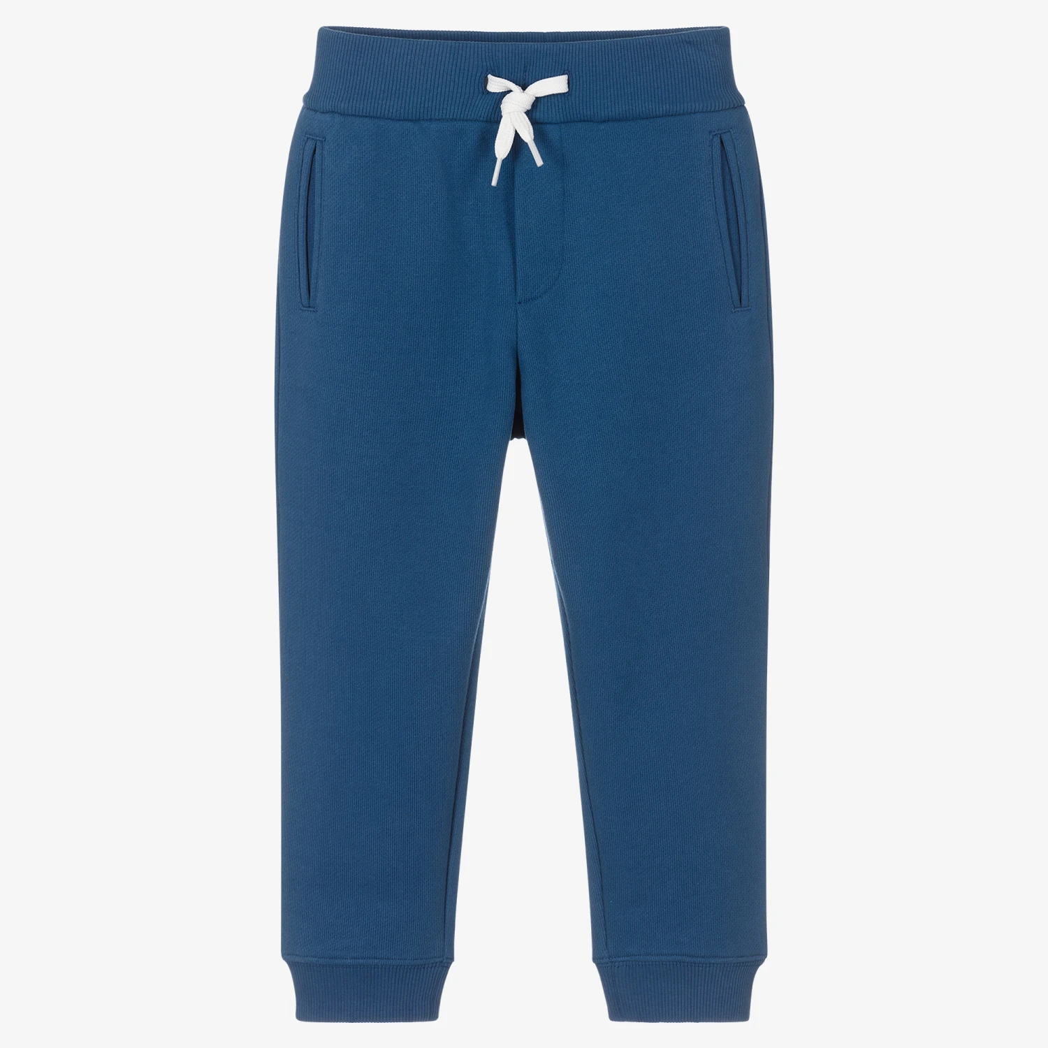 Royal blue Mini-me joggers for boys by Emporio Armani, from the brand’s Earctic Capsule collection. Cosy and comfy to wear, they are made in mid-weight cotton jersey, with a ribbed elasticated waist and faux drawstring. There are useful side pockets, ribbed ankle cuffs, and a grey rubberised Earctic logo on one leg. This product is made from organic fibres.