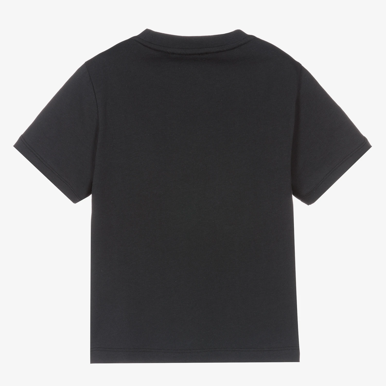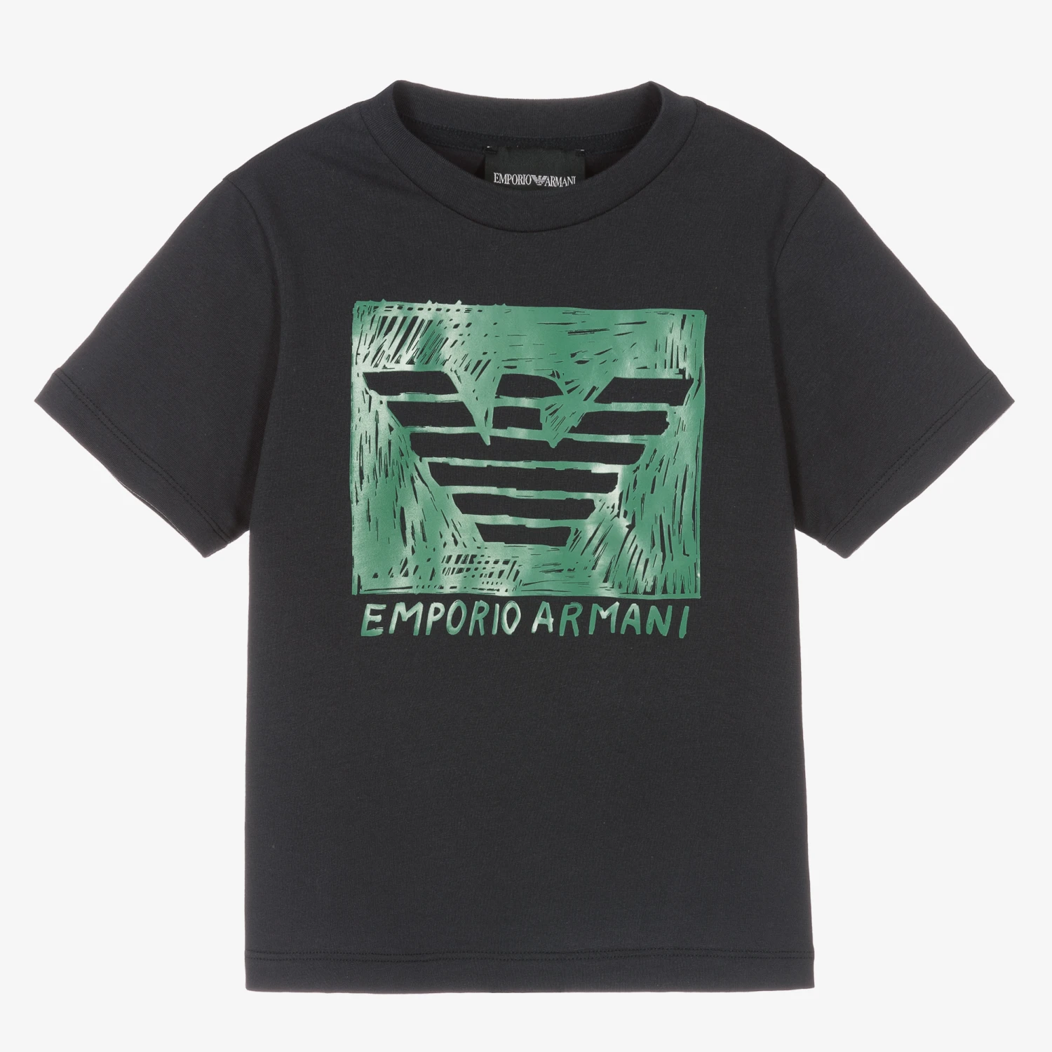 Navy blue T-shirt for boys by Italian brand Emporio Armani, made in soft cotton jersey. It has a green Eagle logo print on the front designed to look sketched, for a stylish streetwear-inspired look. The T-shirt contains recycled and organic fibres.