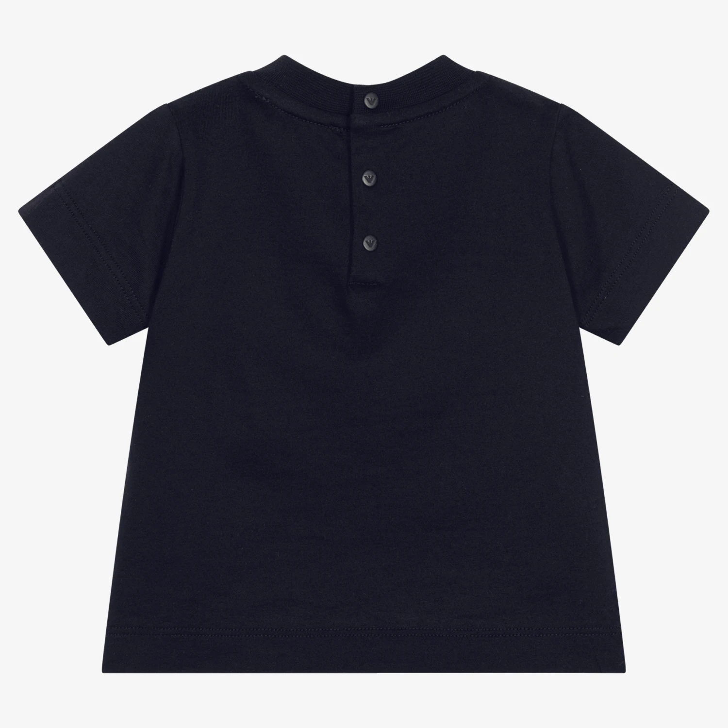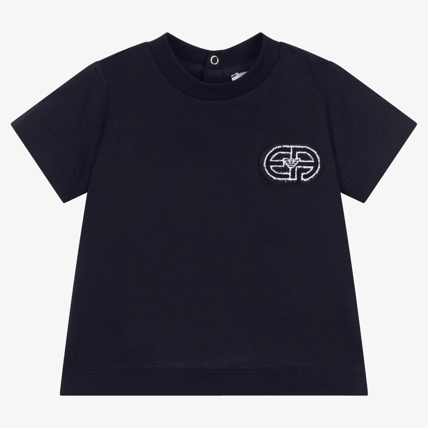 Navy blue T-shirt for little boys by Emporio Armani, made in soft cotton jersey. It has a black and white EA logo patch on the chest, with popper fastenings on the back.