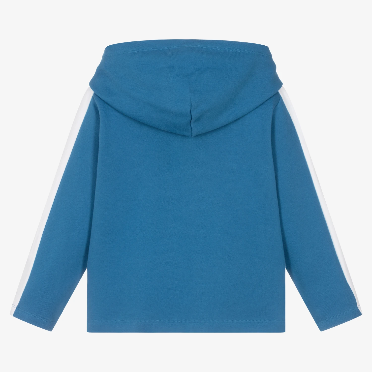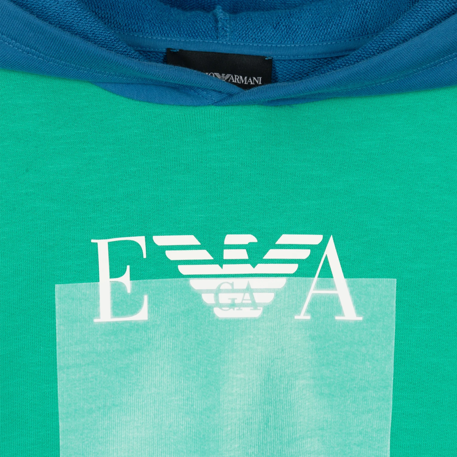Colourblock hooded sweatshirt for boys by Emporio Armani, in green, blue and white. Part of the EA Crew capsule, it is made in comfortable cotton sweatshirt jersey, with a white rubberised logo print and transparent white square detailing on the chest. Both the cuffs and hem are partially ribbed for a quirky finish.