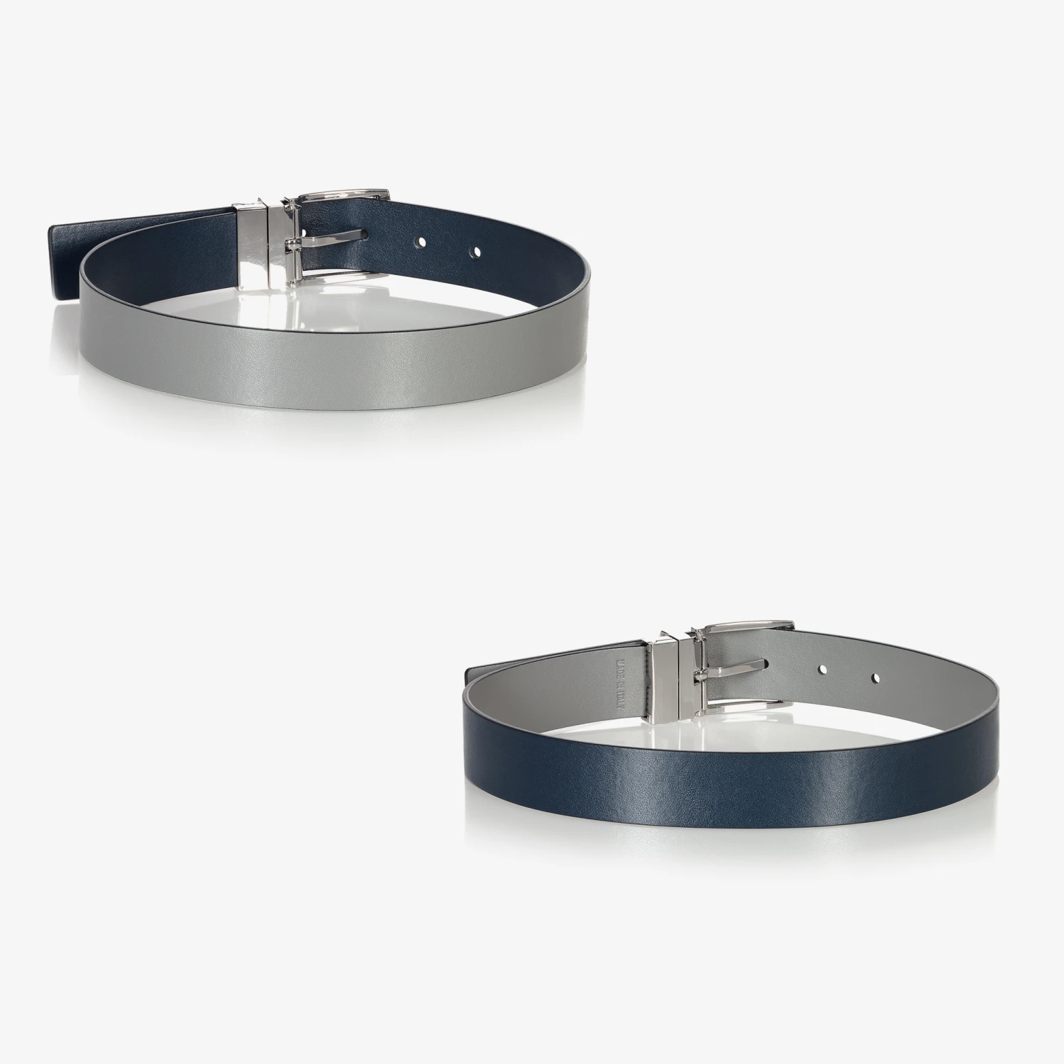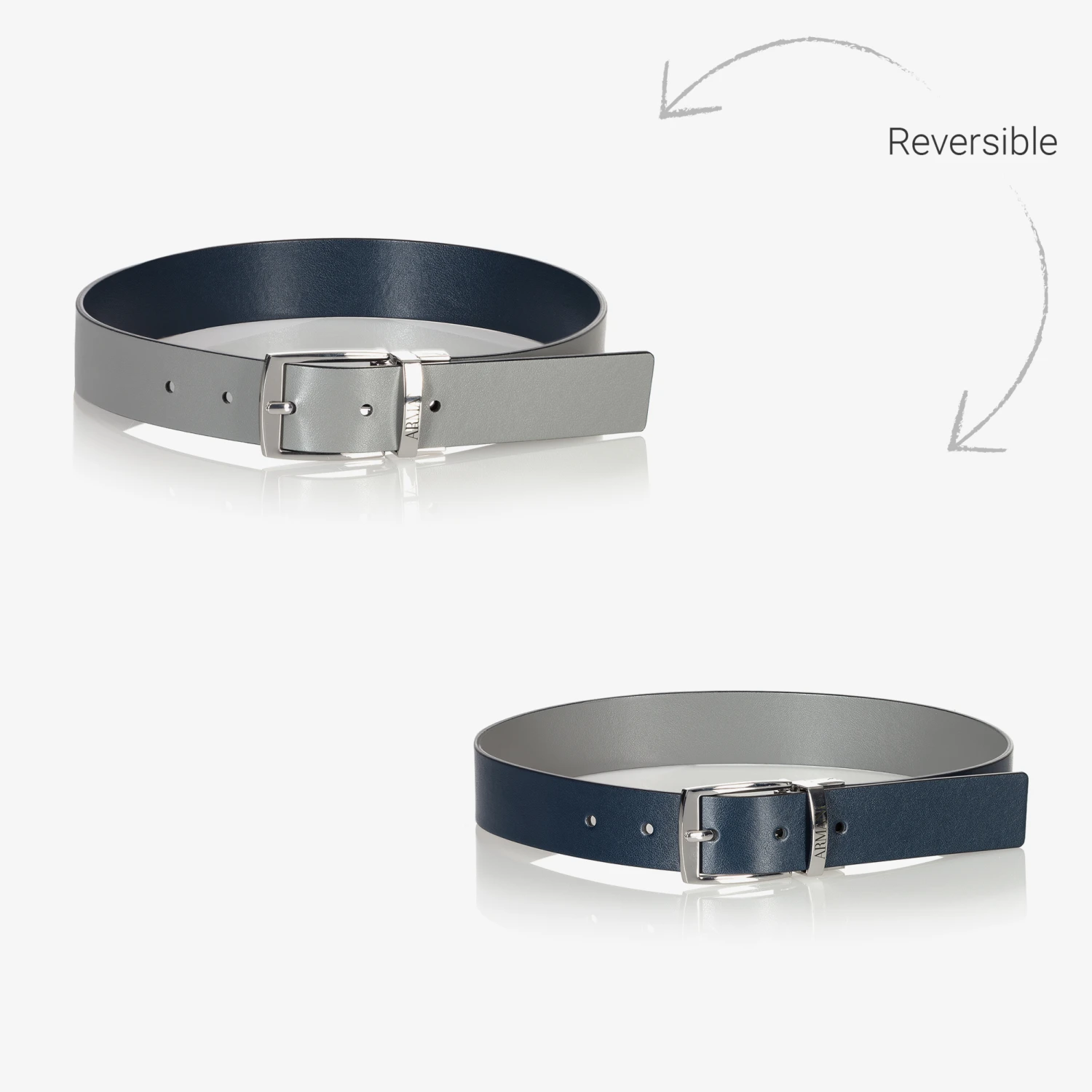 Boys grey and navy blue reversible belt by Emporio Armani, made in soft faux leather. The logo buckle easily pulls out and twists round to offer two different colourways.