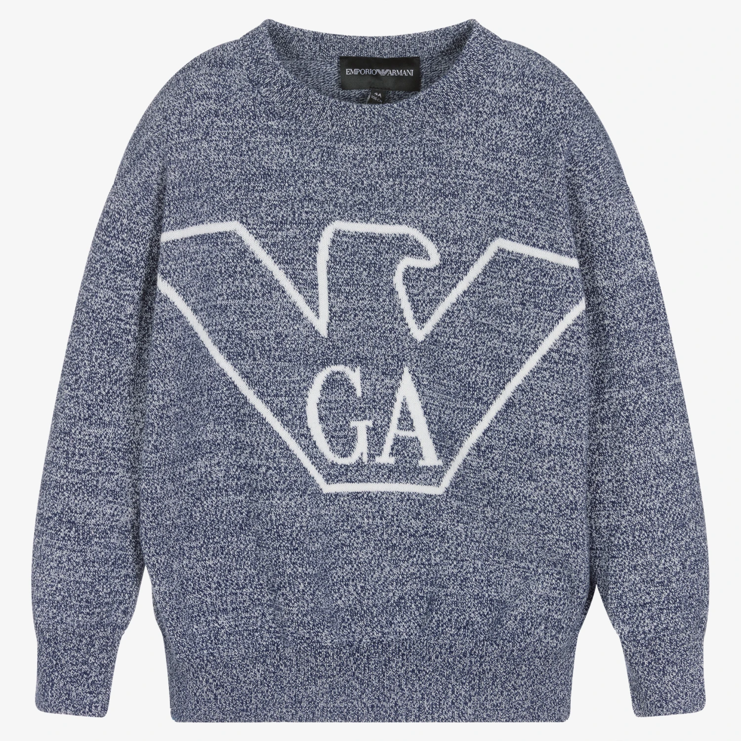 White and navy blue sweater for boys by Italian brand Emporio Armani, knitted in soft and lightweight cotton. It has an intarsia-knit Eagle logo on the front for a cool, statemented style.