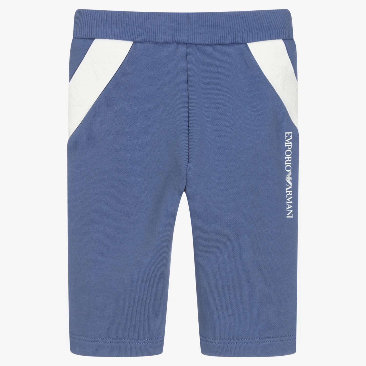 Petrol blue cotton joggers for little boys by Emporio Armani. Made with soft and stretchy sweatshirt jersey, they have white branded tape trims with the designer’s Eagle logo raised detailing, and the Emporio Armani rubberised logo in white on the back. They have a stretchy, comfortable waist.