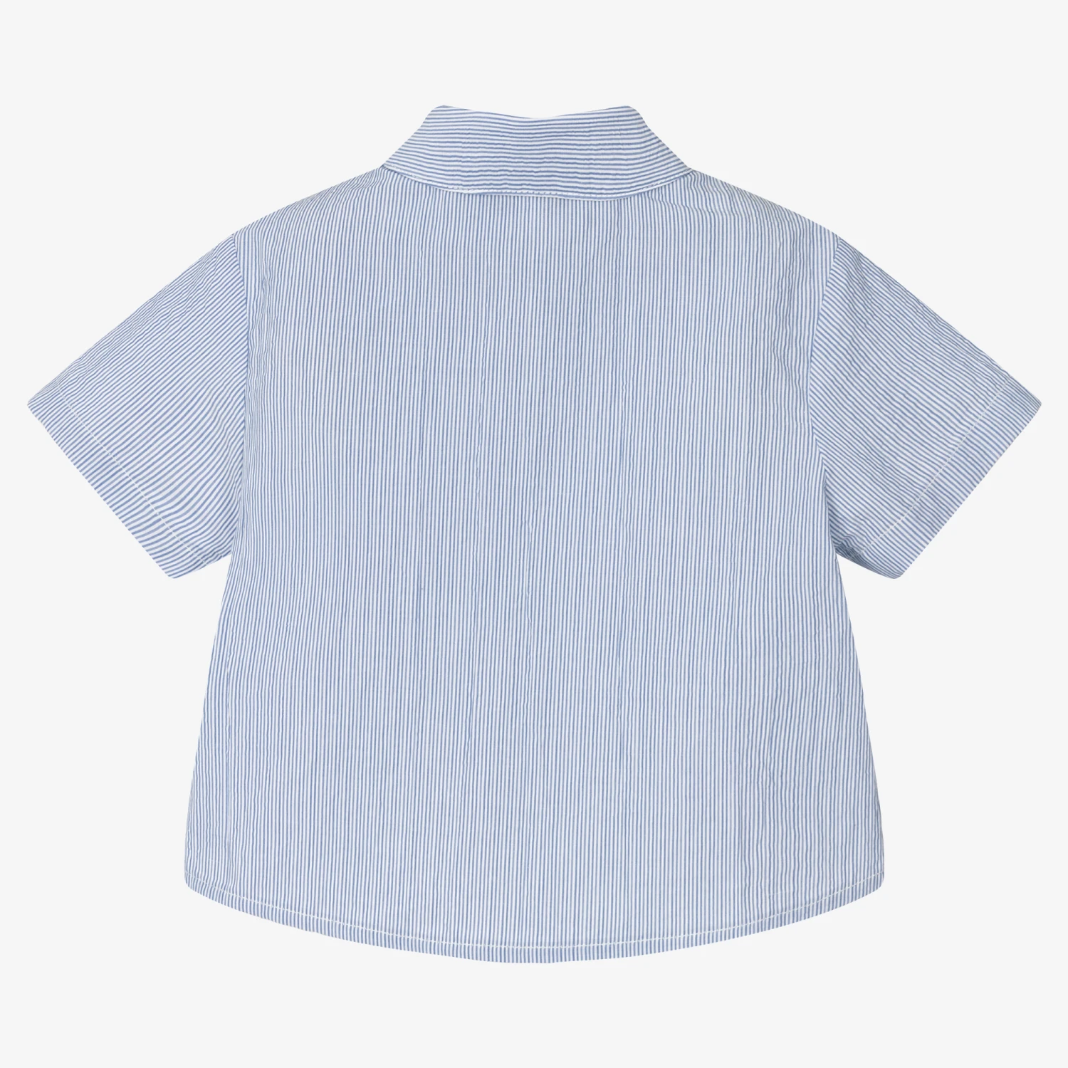 Laid-back blue and white striped shirt for little boys by Emporio Armani, made in lightweight Oxford cotton. Fastening with buttons, this smart casual shirt has white Eagle logo embroidery on the front.