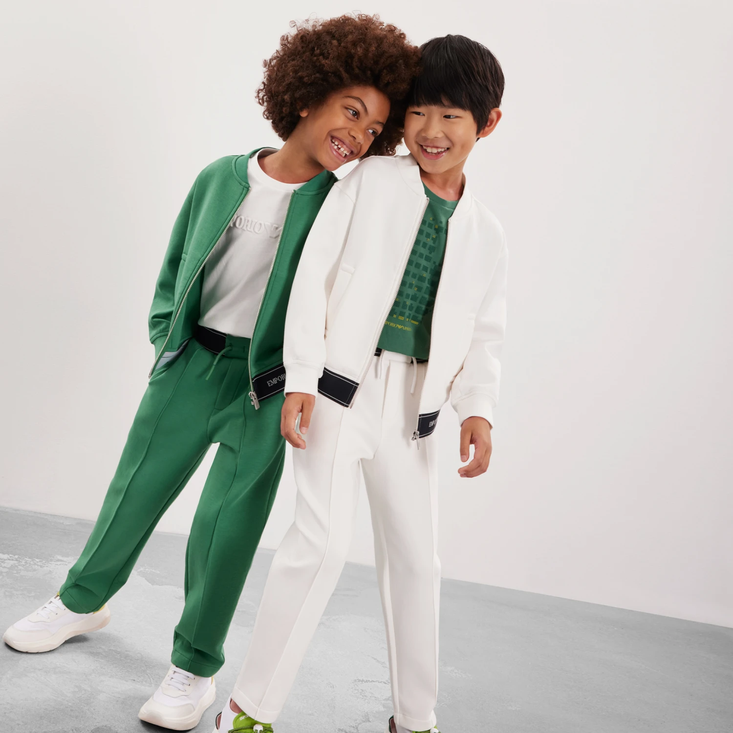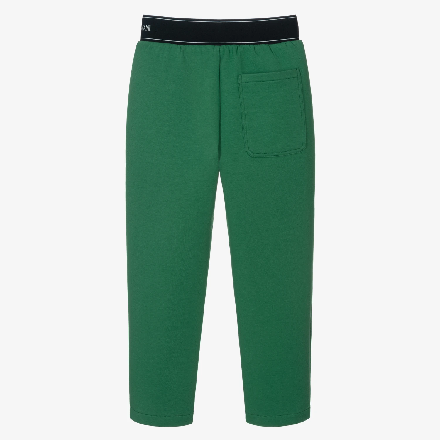 Stylish and casual for boys, a pair of green jersey trousers from Emporio Armani, made with cotton for comfort. An elasticated black waistband with a jacquard logo weave adds designer detail and there are useful pockets on the front and back. Stitched front seams and a faux drawstring complete the look.
