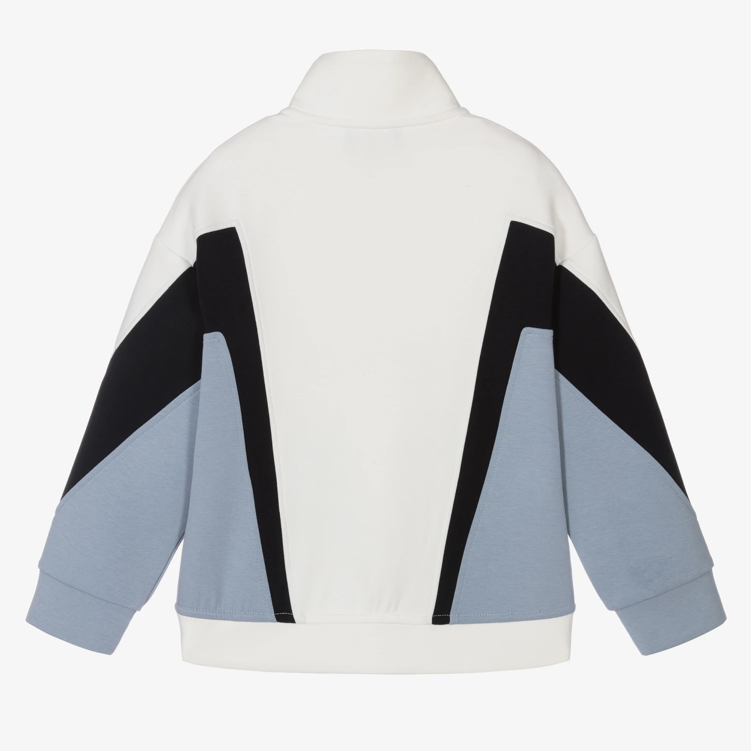 Stylish zip-up top for boys by Emporio Armani, in colourblocks of ivory, slate blue and black. Made in double-faced cotton jersey, it has a luxuriously soft feel. A branded ivory zip fastening and contrast rubberised logo print on the hem add a designer finish and there are useful concealed side pockets.
