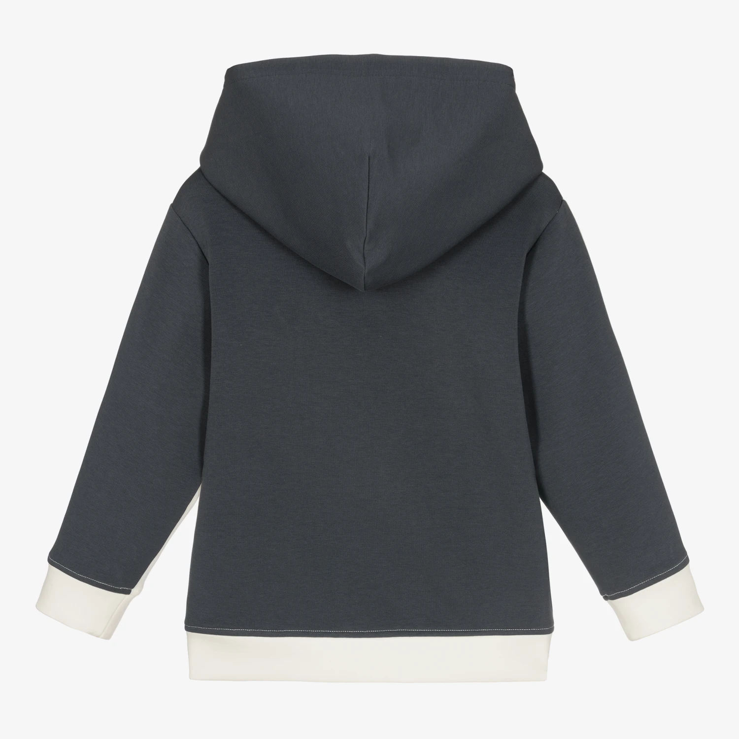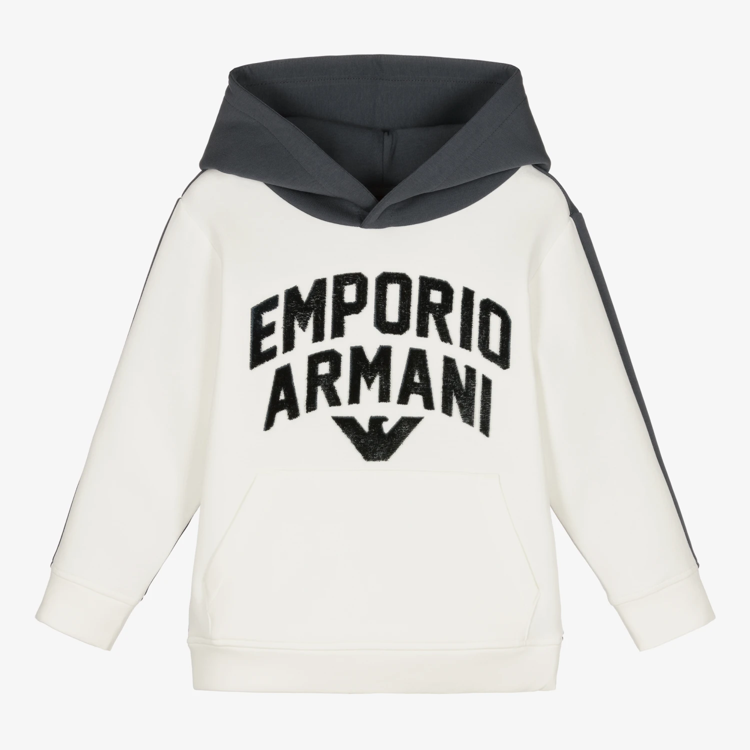 Boys blue and pale ivory varsity-style hoodie by luxury Italian brand Emporio Armani. Made in a stretchy sports jersey, it has the designer’s logo in super soft velvet appliqué on the front.
