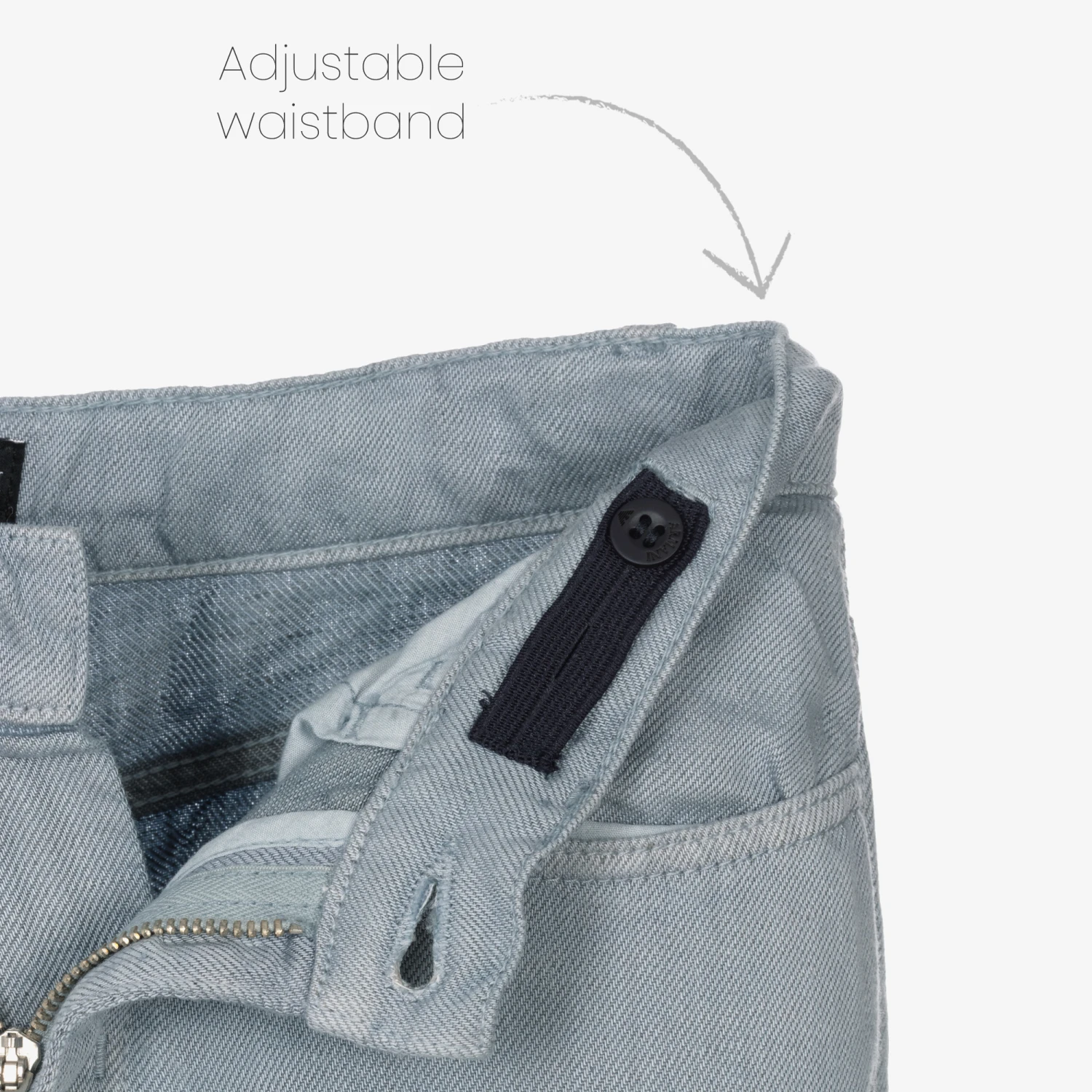 Light blue trousers for boys by Emporio Armani. Made in a soft lyocell and linen blend, they have an adjustable waistband for a comfortable fit. Designed in the style of jeans, they have classic five pocket styling, with a metal logo plate on the front and a metal Eagle logo plate on the back. There is a branded button and zip fastening for an extra designer touch.