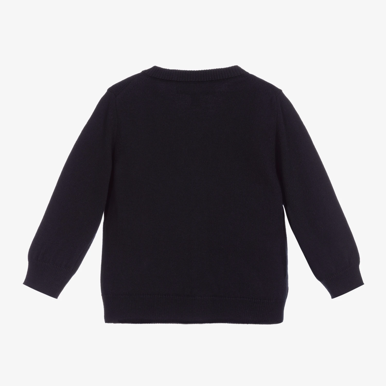A smart navy blue cardigan for little boys by luxury brand, Emporio Armani. Made in a softly knitted cotton and wool blend, this V-neck cardigan has the signature navy blue eagle logo printed on the chest.