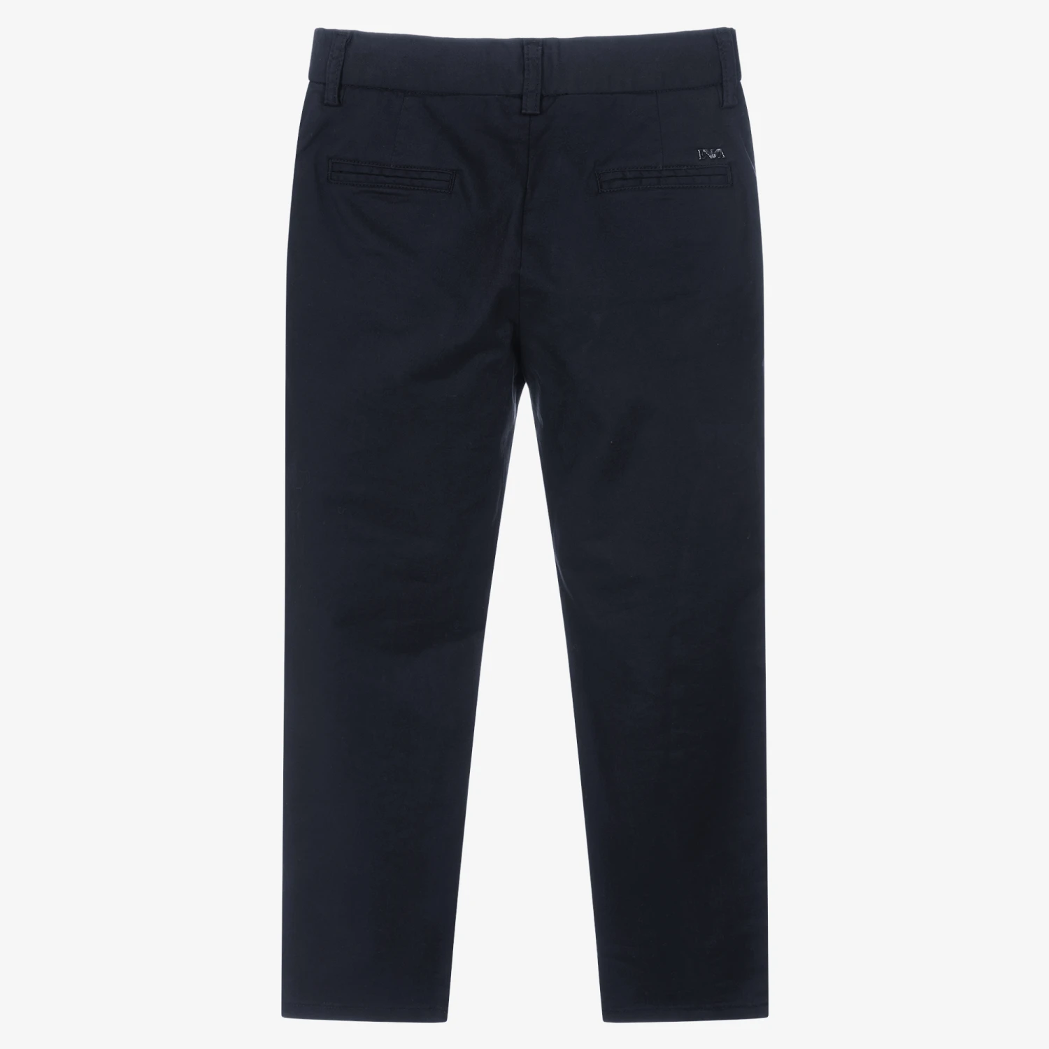 Navy blue chino trousers for boys by Emporio Armani, made in soft mid-weight cotton, with pockets on the front and back. There is a metal Emporio Armani logo on the back. They fasten with a button and zip and have useful adjustable waist.