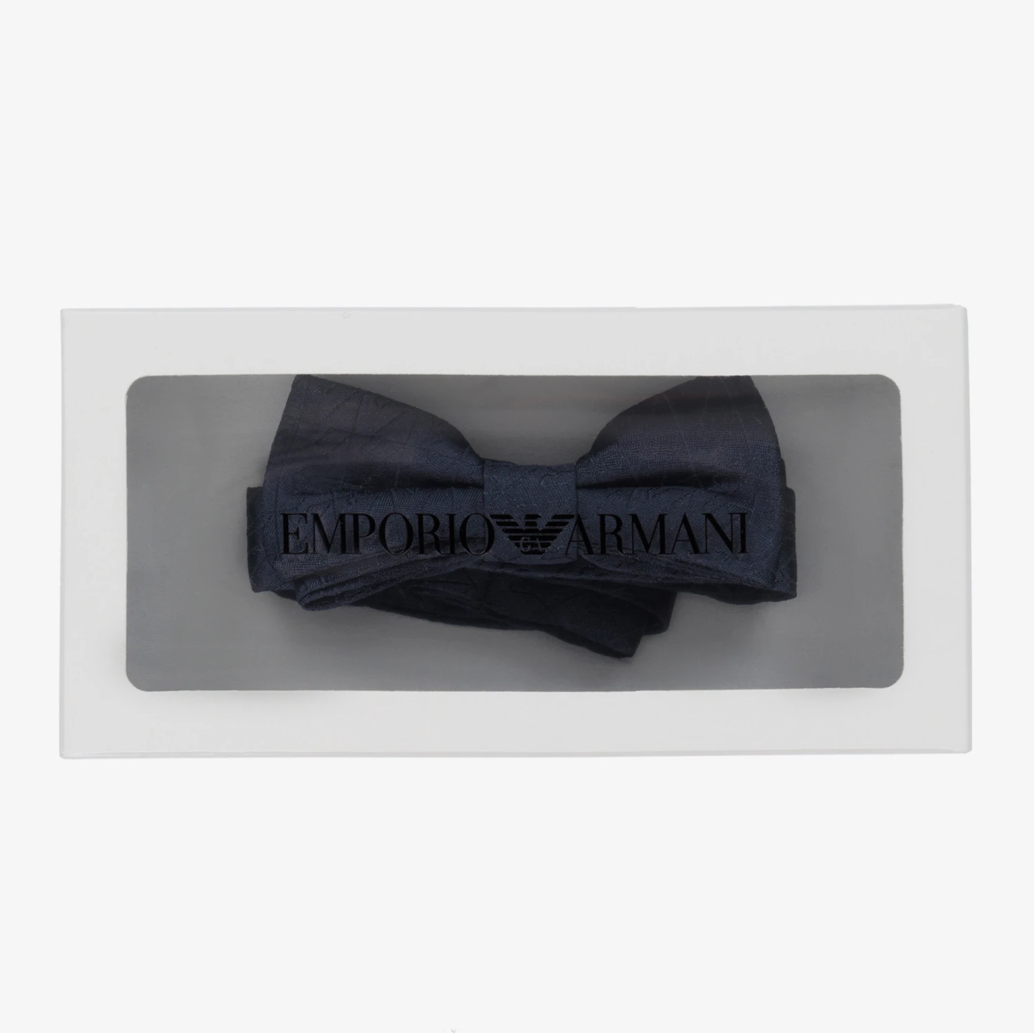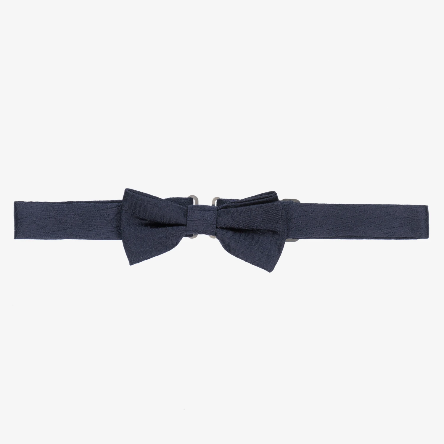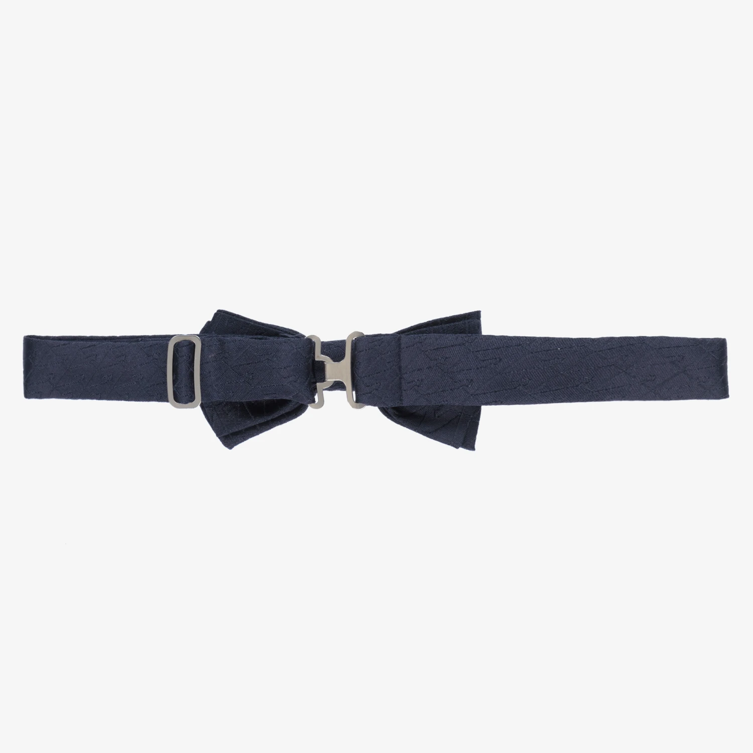 Boys navy blue bow tie by Italian designer, Emporio Armani. It is made in luxurious silk with a subtle jacquard logo. It has an adjustable strap that fastens with a metal clasp.