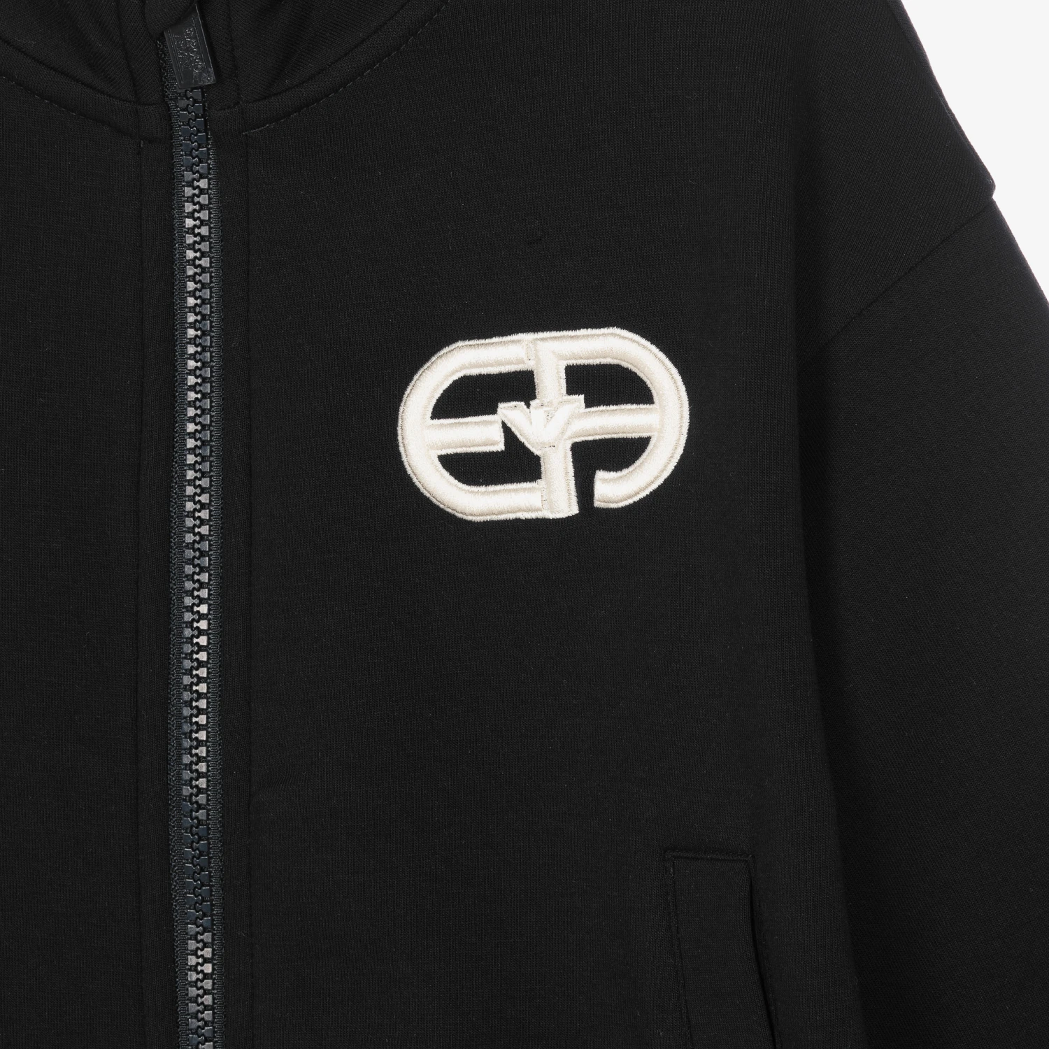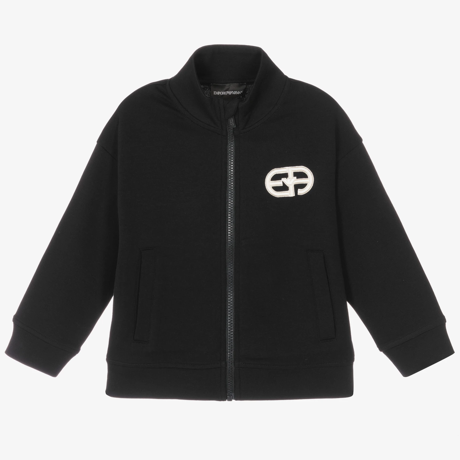 Navy blue zip-up top for boys from Emporio Armani, made from soft cotton blend jersey. Easy to wear, it fastens with an exposed branded zip and has an embroidered white EA on the chest including the brand’s signature Eagle logo. It has a high neck to keep the cold out and two front pockets ideal for warming hands in.
