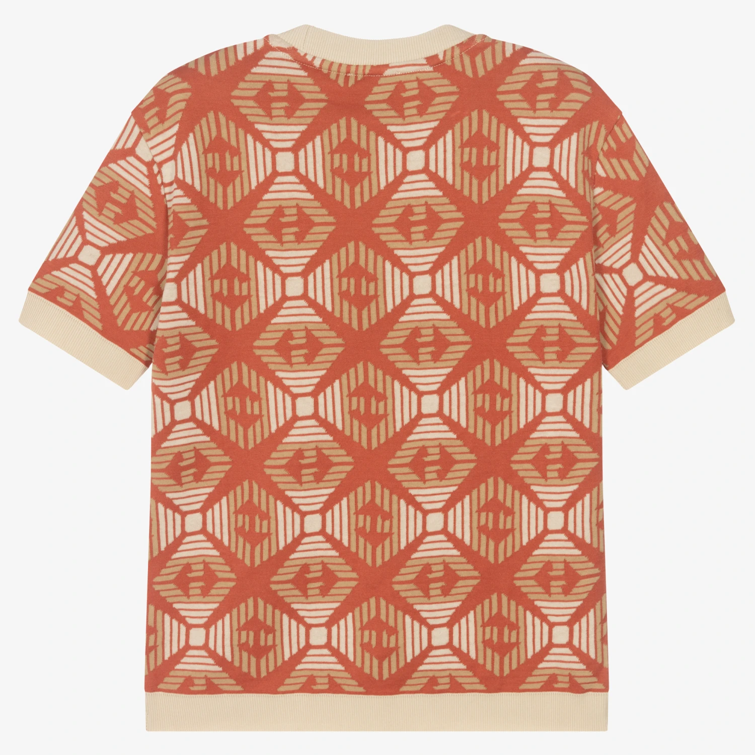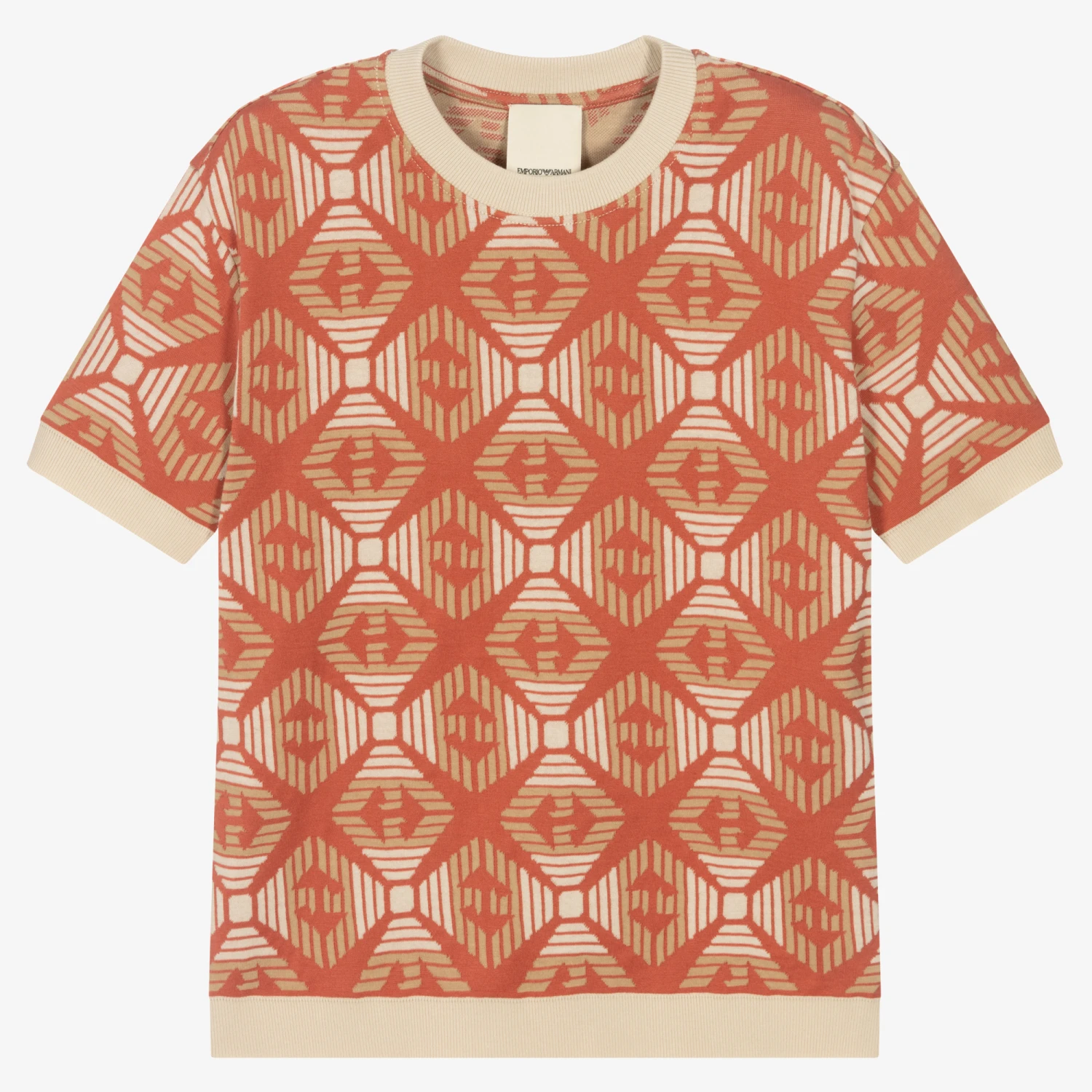 Short-sleeved orange Mini-me T-shirt for boys by Italian brand Emporio Armani. A statement piece, it features the designer’s iconic Eagle logo in a stylish orange, beige and ivory jacquard pattern. Using organic cotton, it is made in a fine jersey knit with stretchy ribbed trims