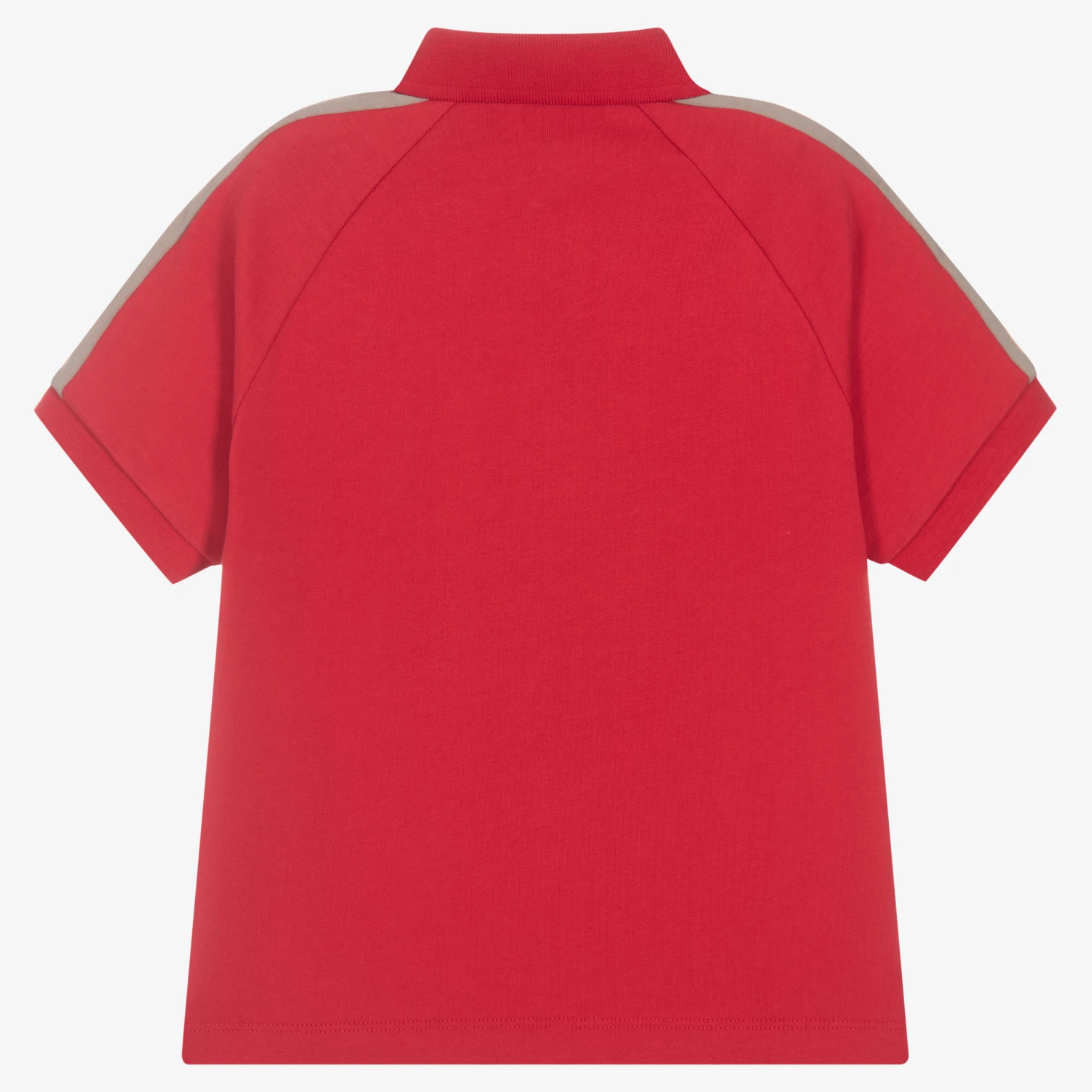 Casual red polo shirt for boys by Emporio Armani, with a white and beige striped trim on the sleeves. Made in soft cotton jersey, it has the brand’s rubberised iconic Eagle logo on the chest in ivory. There are branded button fastenings on the front for a subtle designer finish.