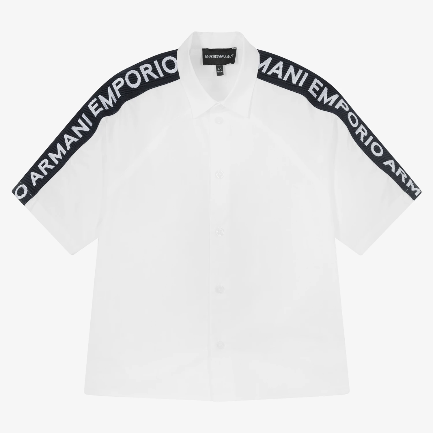 Directly inspired by the adult collection, a mini-me white cotton shirt for boys by Emporio Armani, with black logo tape trims. Made in soft lightweight poplin for a smart look, it has a small pointed collar and fastens with branded buttons on the front, for an added designer touch.