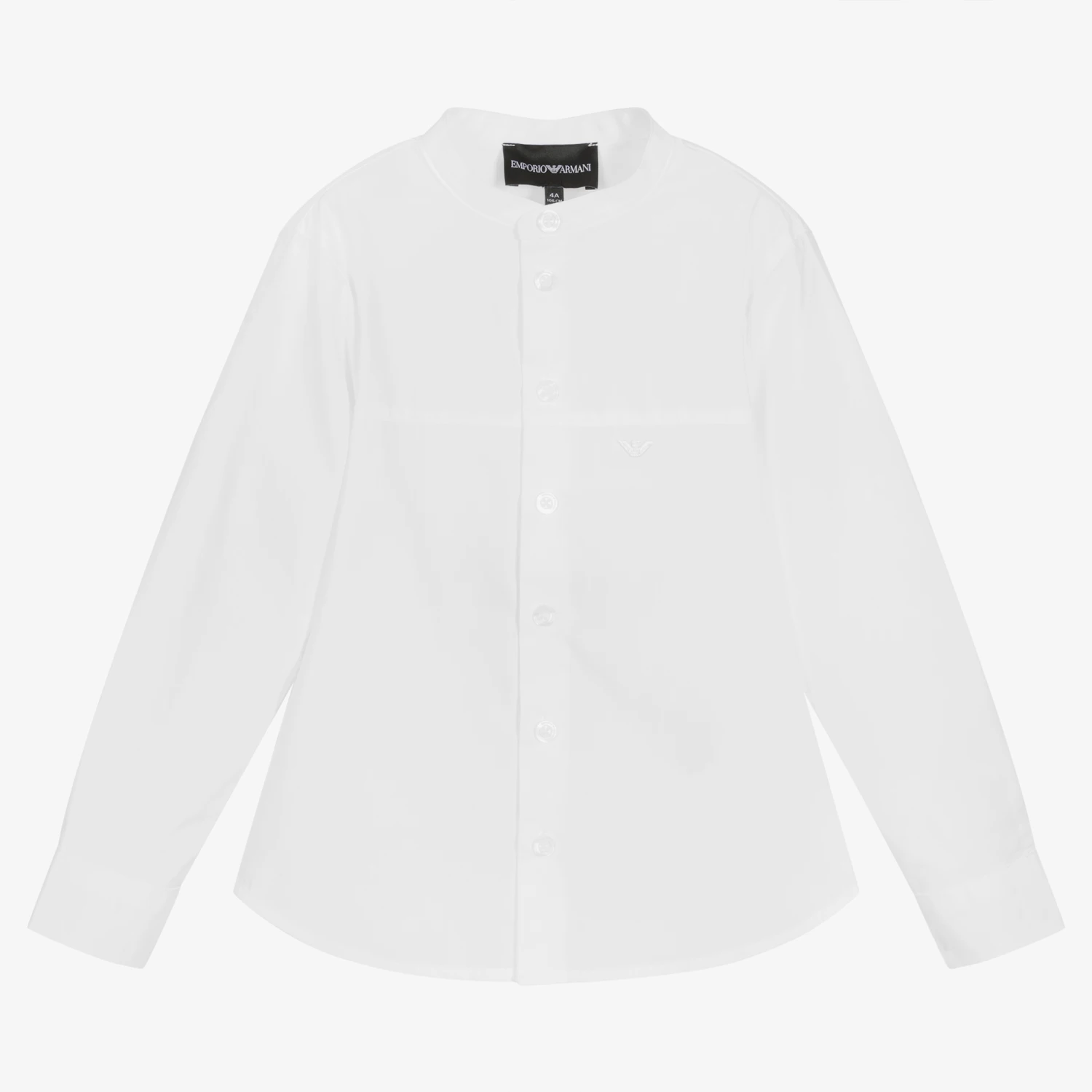 Smart white shirt for boys by Emporio Armani, made in lightweight cotton poplin. In a stylish collarless design, it has the designer’s distinctive small Eagle logo embroidered on the chest and fastens with logo-embossed buttons for a discreet branded finish.
