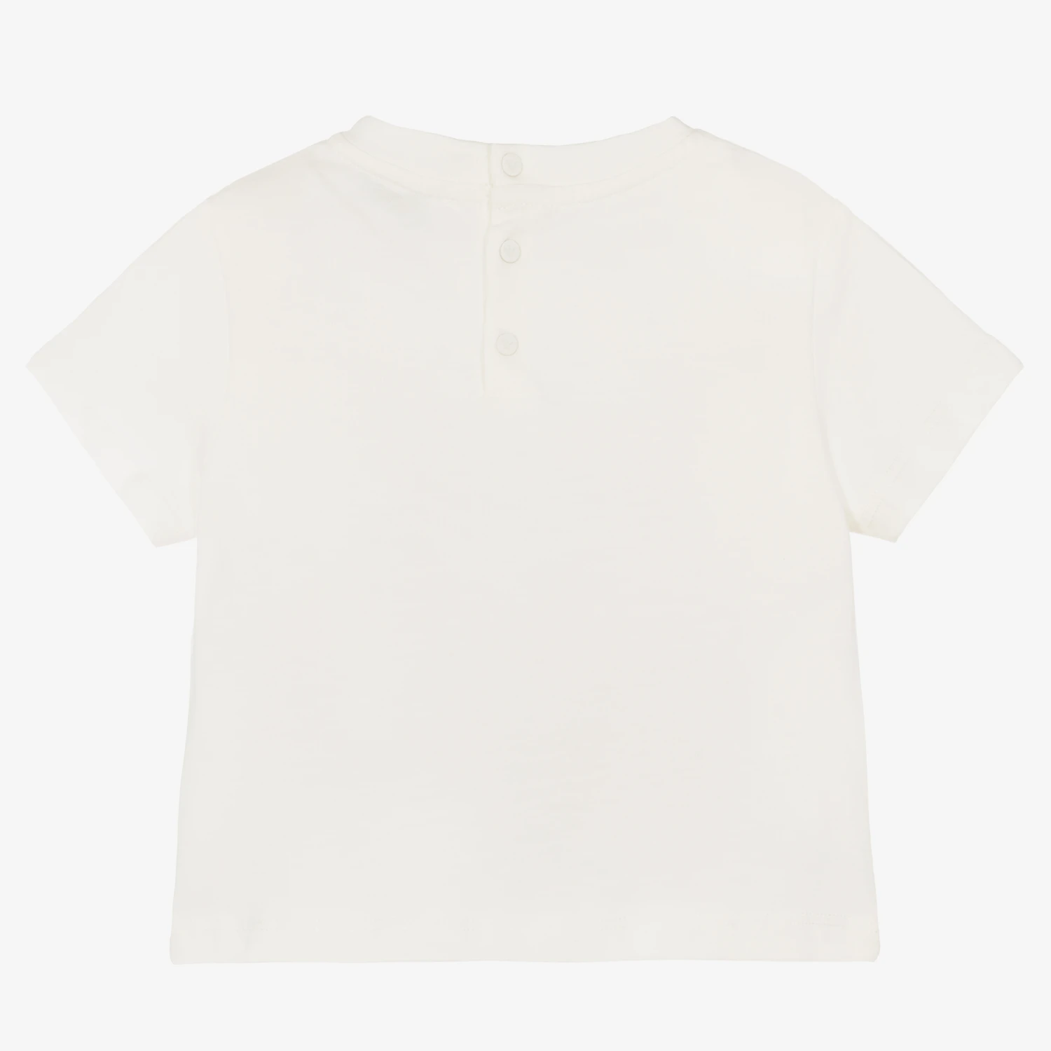 White crew neck T-shirt for little boys, by Emporio Armani. Made in soft cotton jersey, it has a cool blue and white striped graphic on the front with the brand’s iconic Eagle logo. It fastens with logo-embossed poppers on the back for a stylish addition to easy dressing. This product contains organic and recycled fibres.
