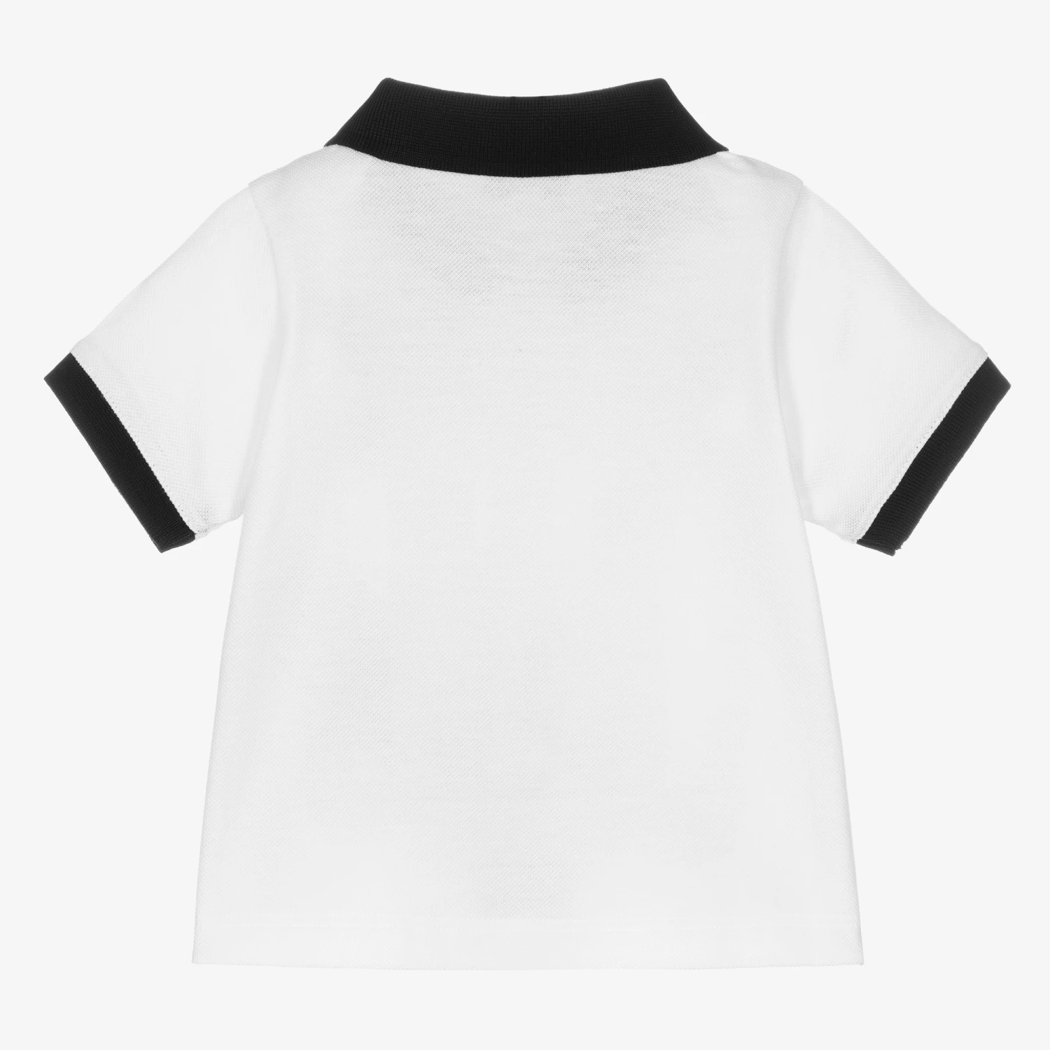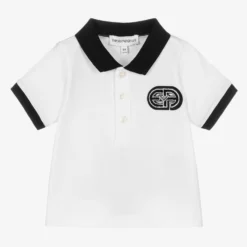 White polo shirt for little boys from Emporio Armani, with contrast navy blue trim. Made in soft cotton piqué, it has branded button fastenings and a flocked r-EAcreate and Eagle logo appliqué on the chest in black, white and blue.