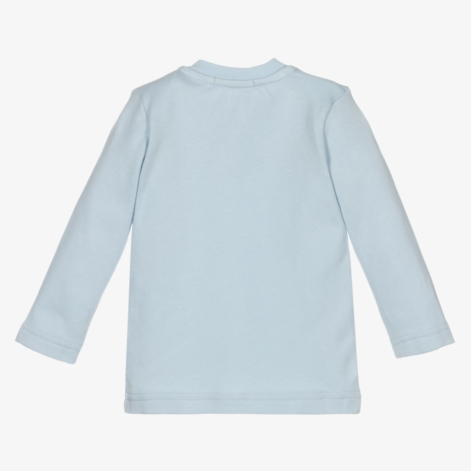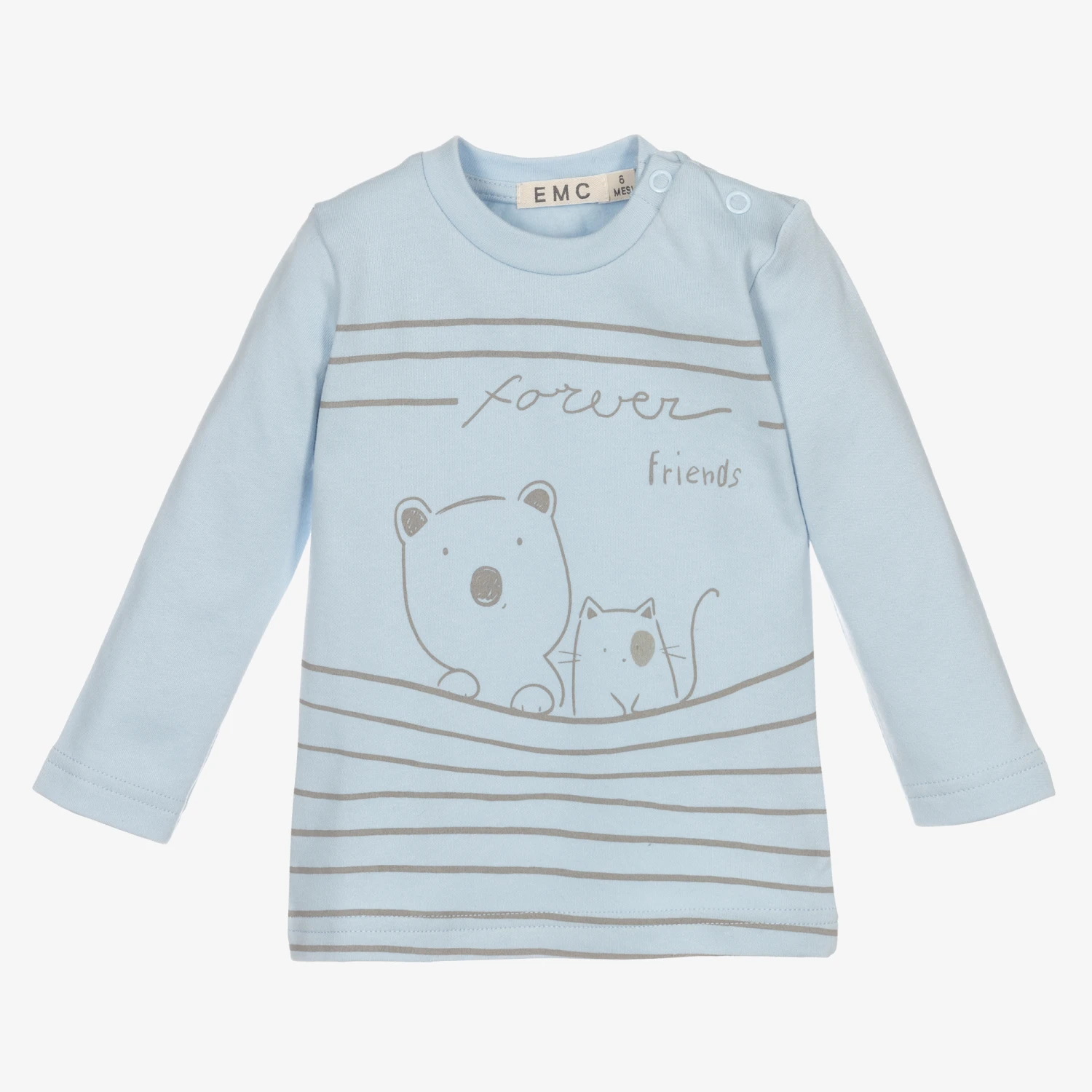 Pale blue cotton jersey top for baby boys and girls by Everything Must Change. It has grey stripes printed on the front, together with two cute ‘forever friends’. There are popper fastenings on one shoulder for easy dressing.