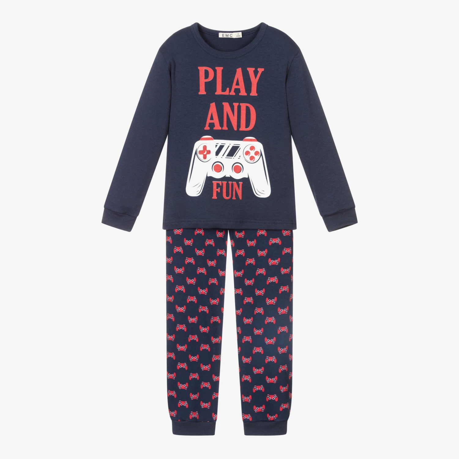 Boys navy blue pyjamas from Everything Must Change, with a white and red gaming-themed print. They are made in soft and stretchy cotton jersey with a warm brushed feel inside. The trousers have a matching pattern and a comfortable elasticated waistband.