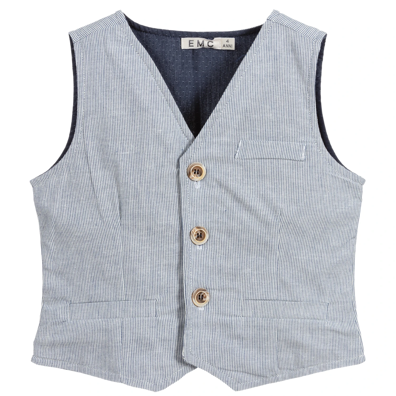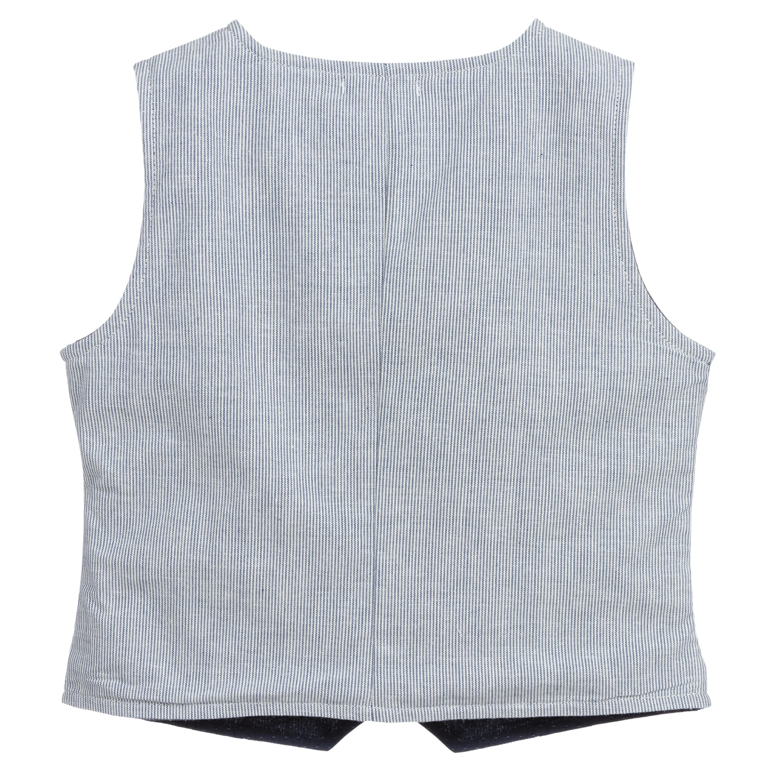Boys cotton waistcoat by Everything Must Change, with a narrow blue and white stripe. It has a dark blue lining and fastens with buttons on the back.