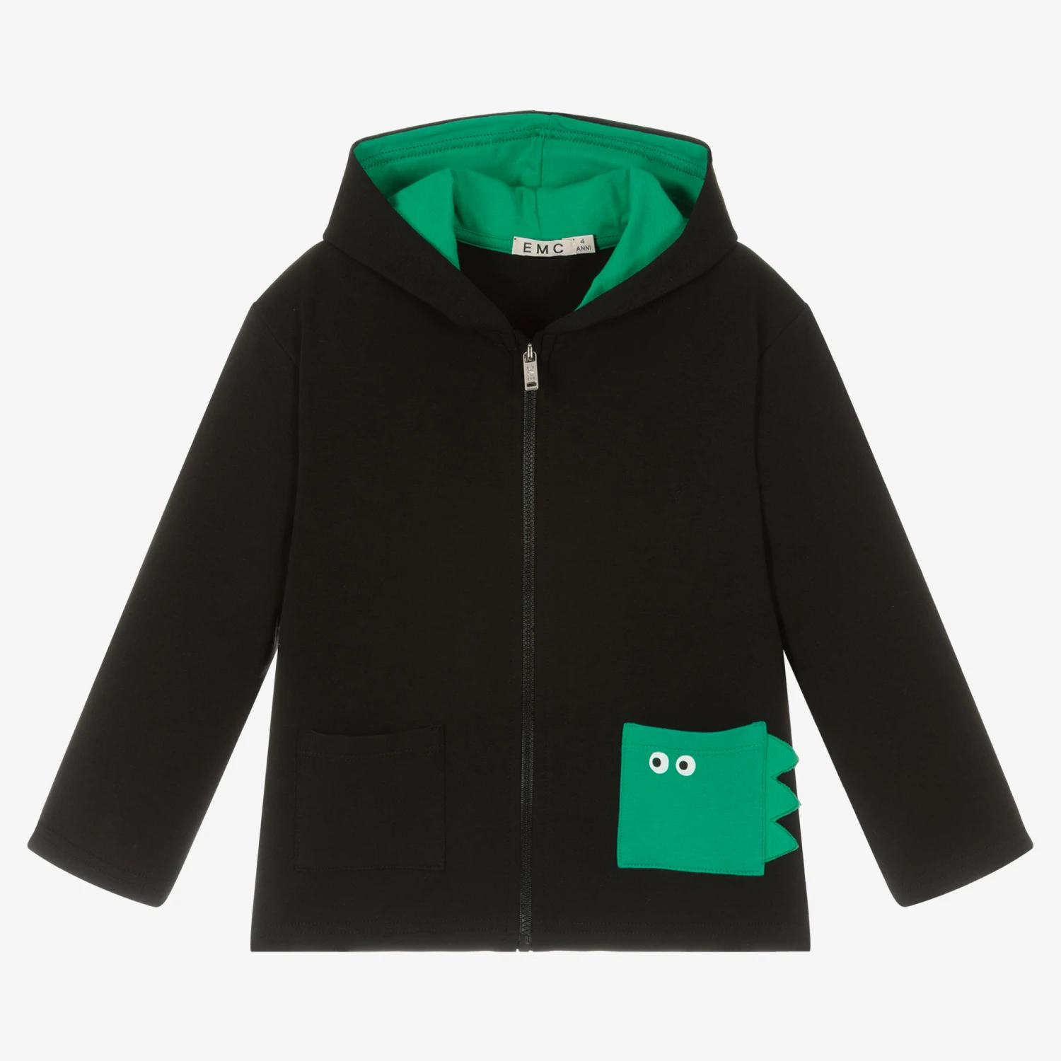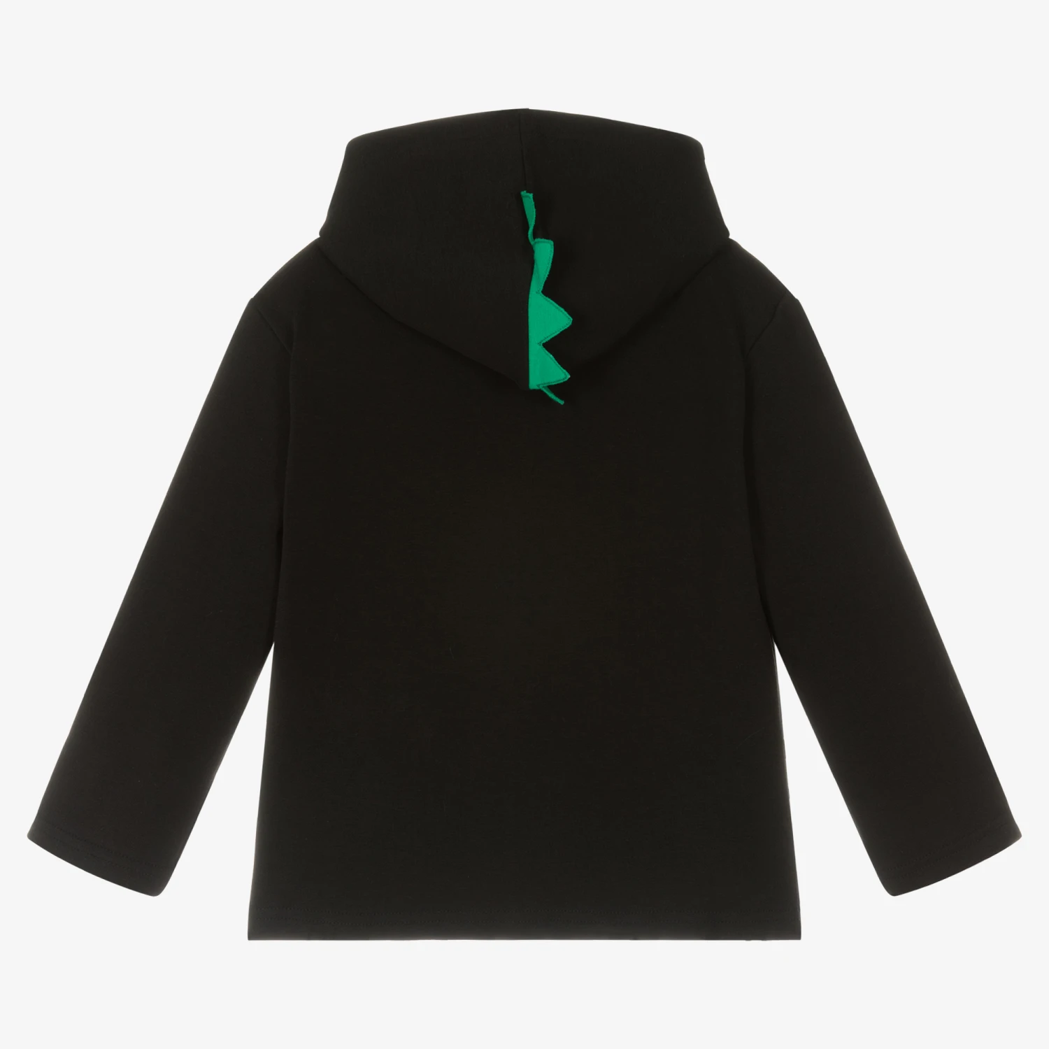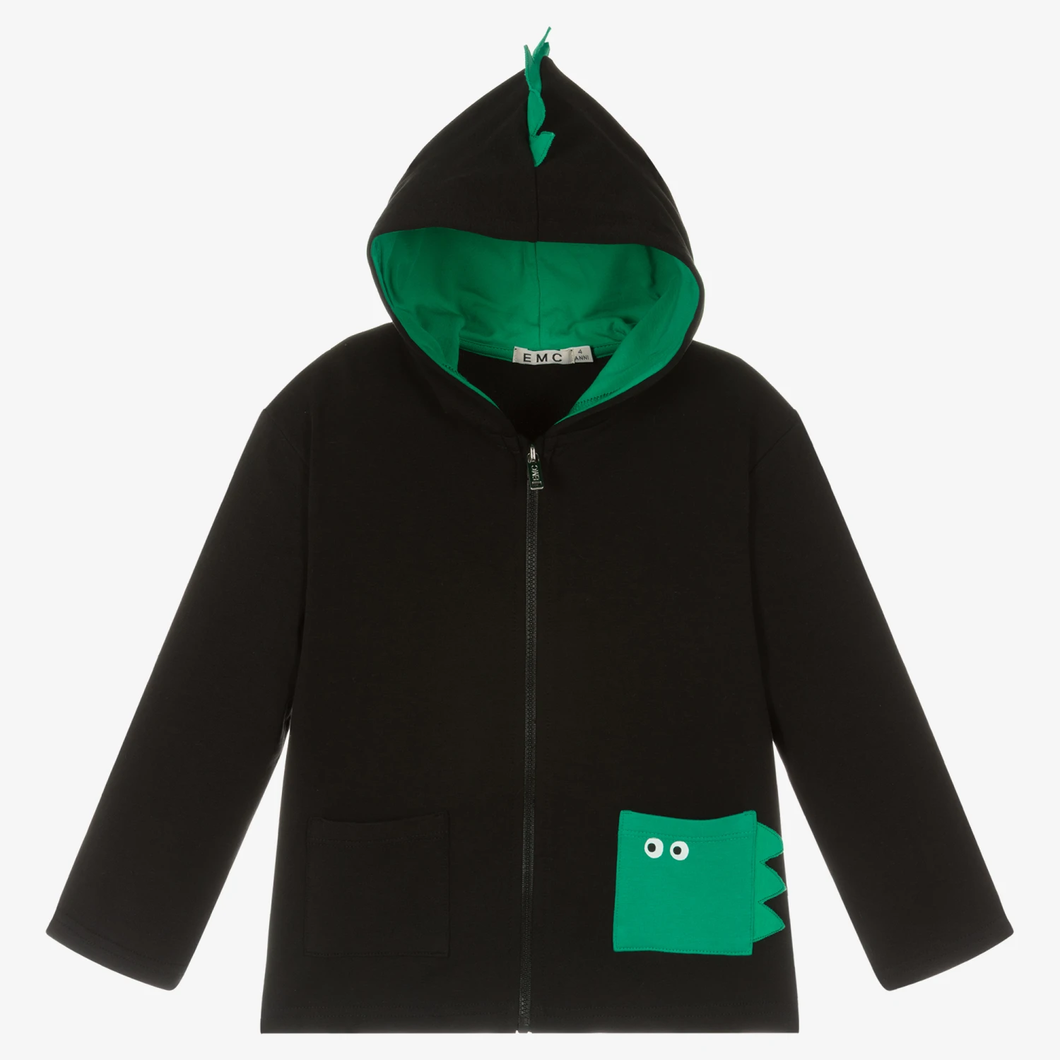 A black zip-up hoodie for little boys by Everything Must Change, made from soft cotton jersey. Fun yet functional, the hood is lined in a green jersey fabric, with matching crocodile spikes appliquéd on top. One of the front pockets is green, printed with cartoon-like eyes with spiked detailing for a playful finishing touch.