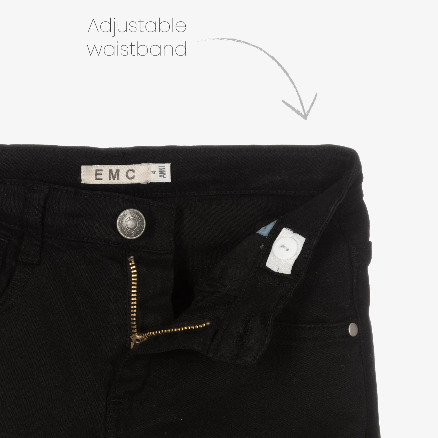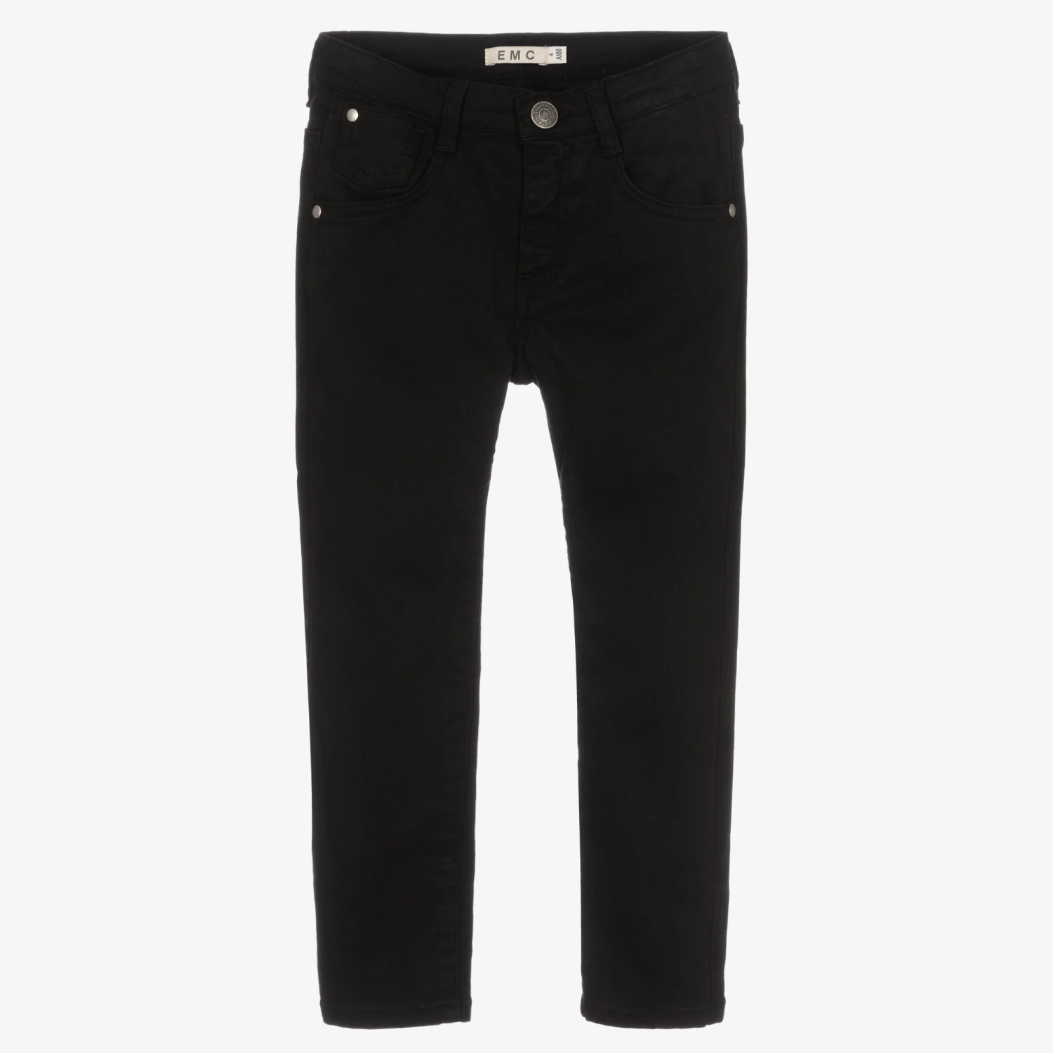 Black slim fit trousers for boys by Everything Must Change, made in soft cotton with a slight stretch for comfort. In a jeans style, they have five pockets and fasten with a zip and branded button. The waistband is adjustable for a comfortable fit.
